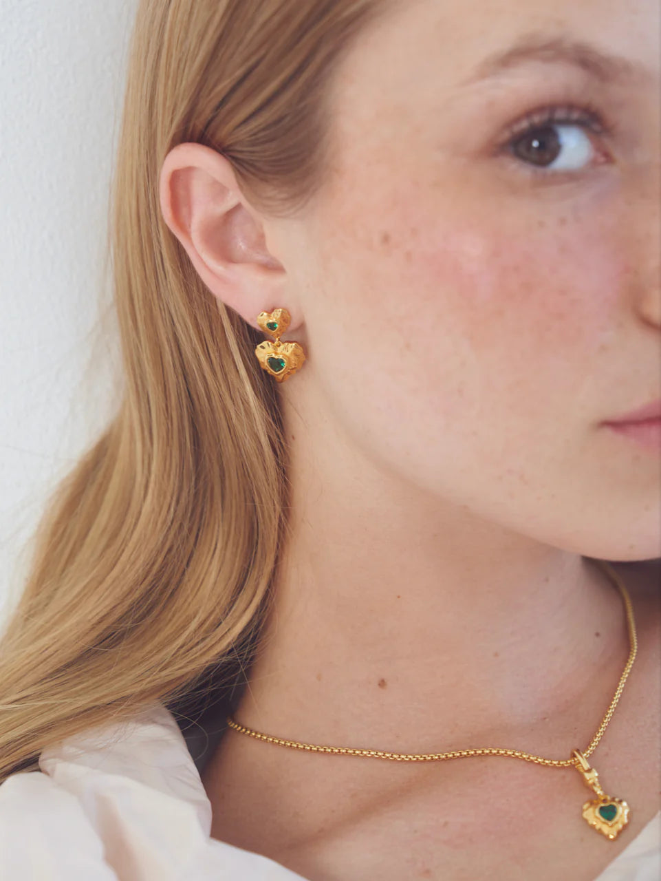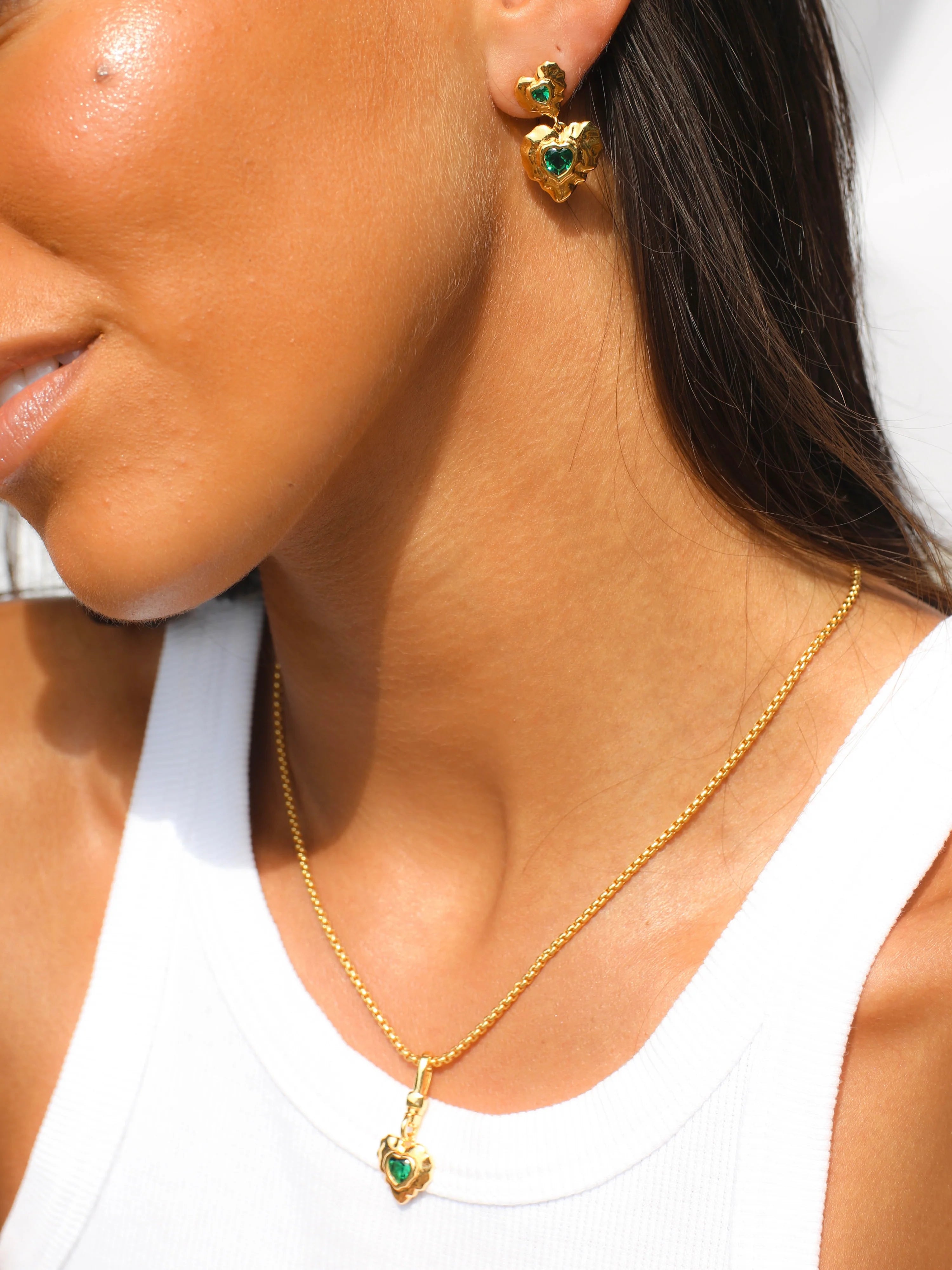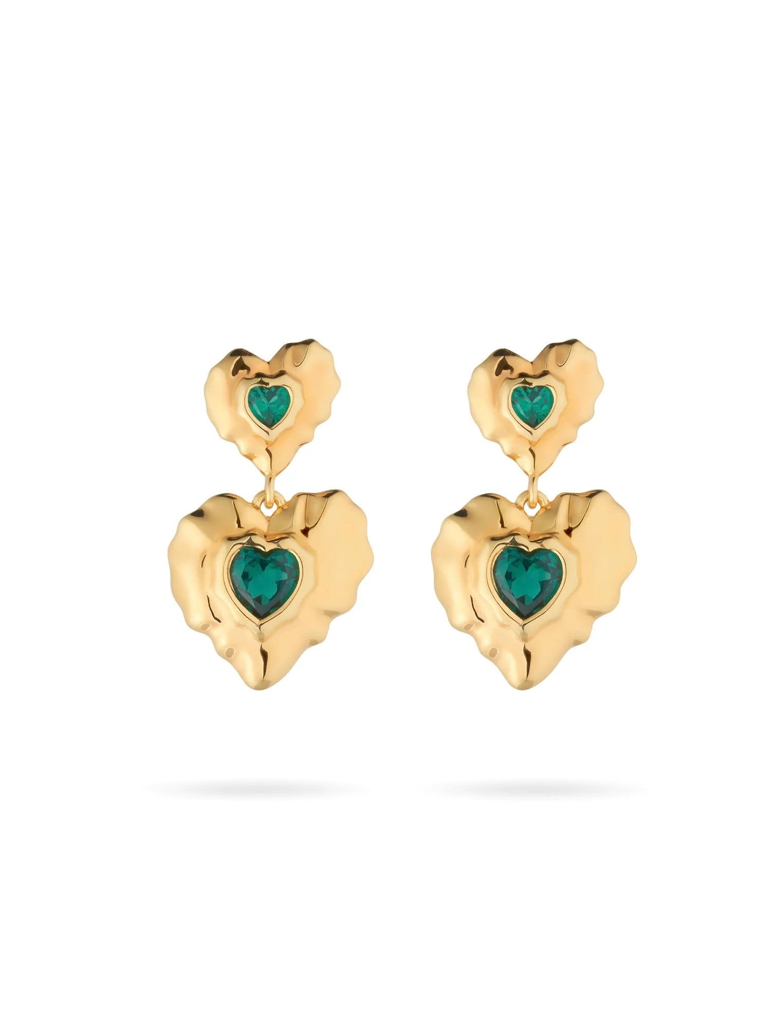 The Annasophia Earrings are sure to capture your heart. Featuring a pair of organically heart shape earrings set with an emerald coloured gem.