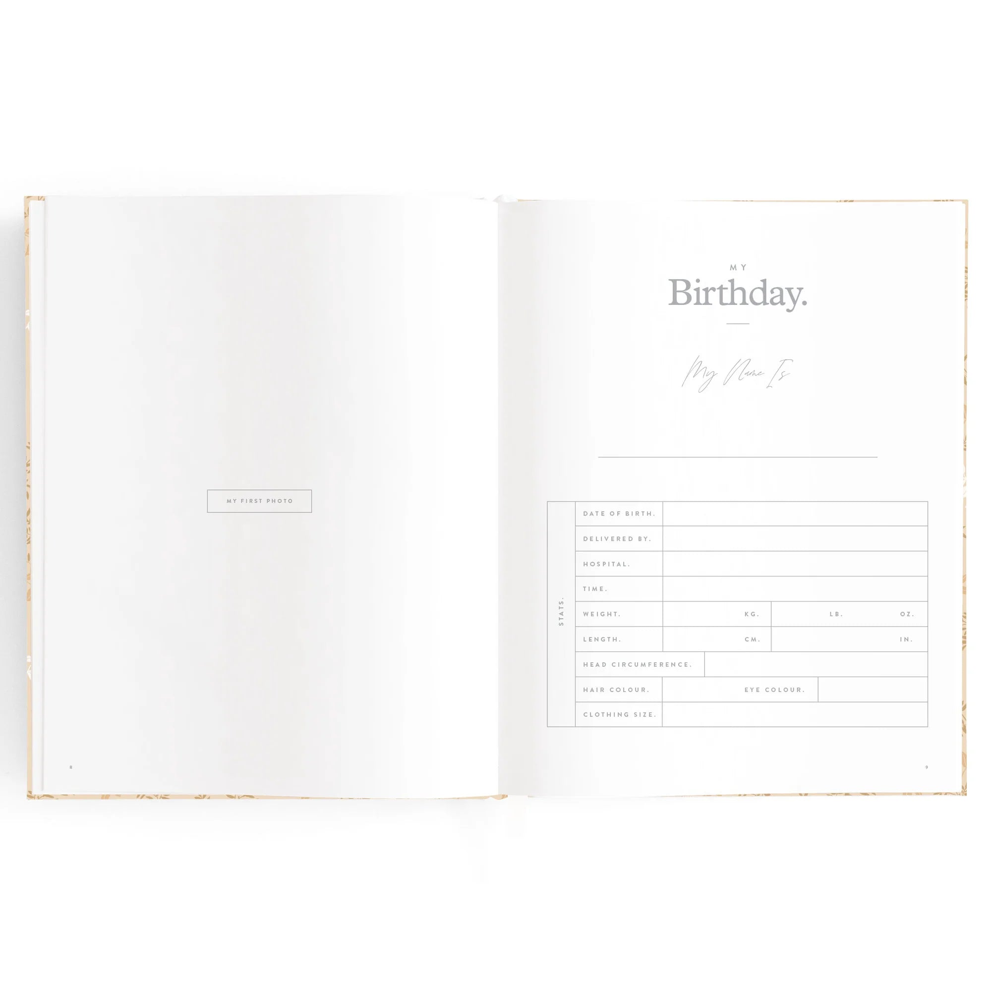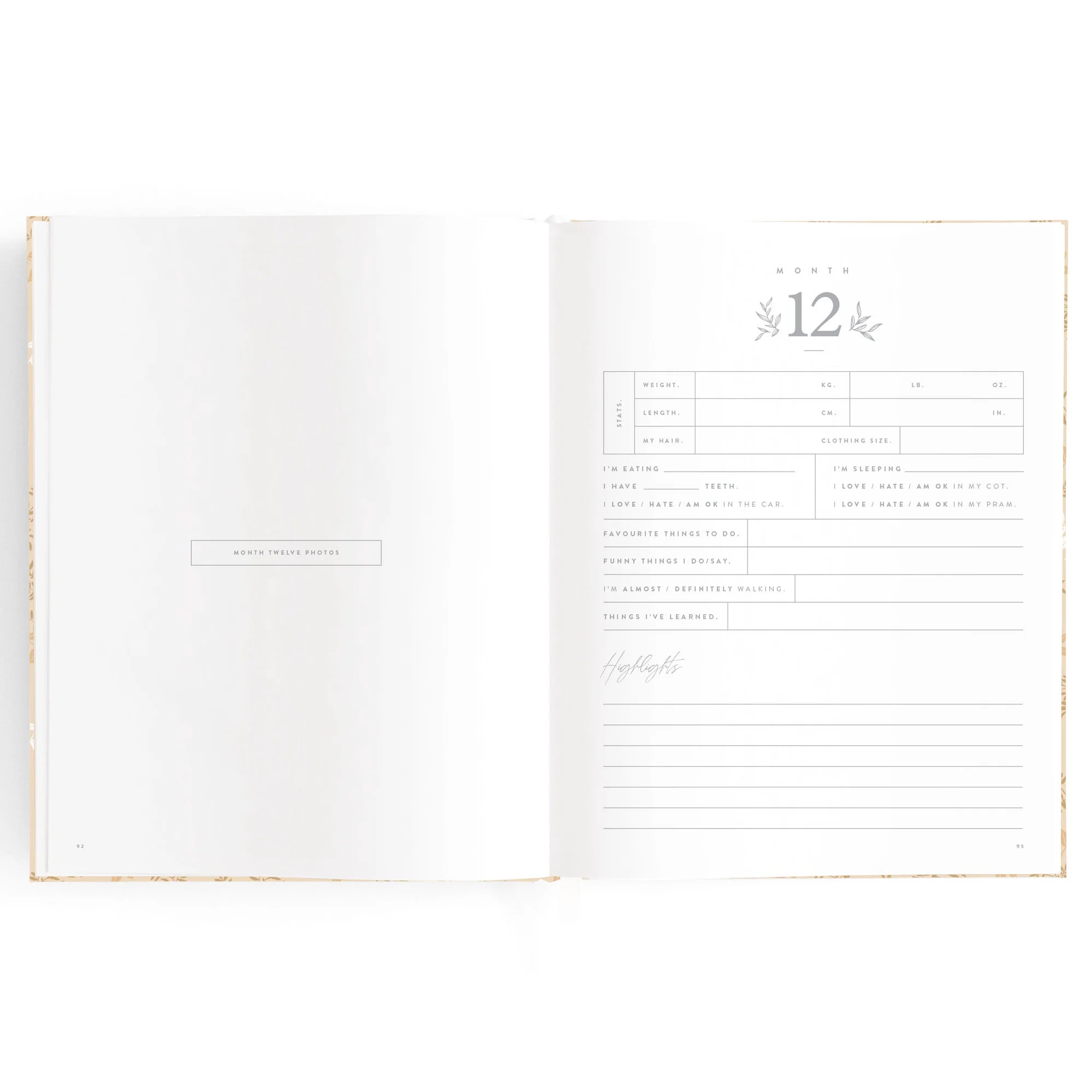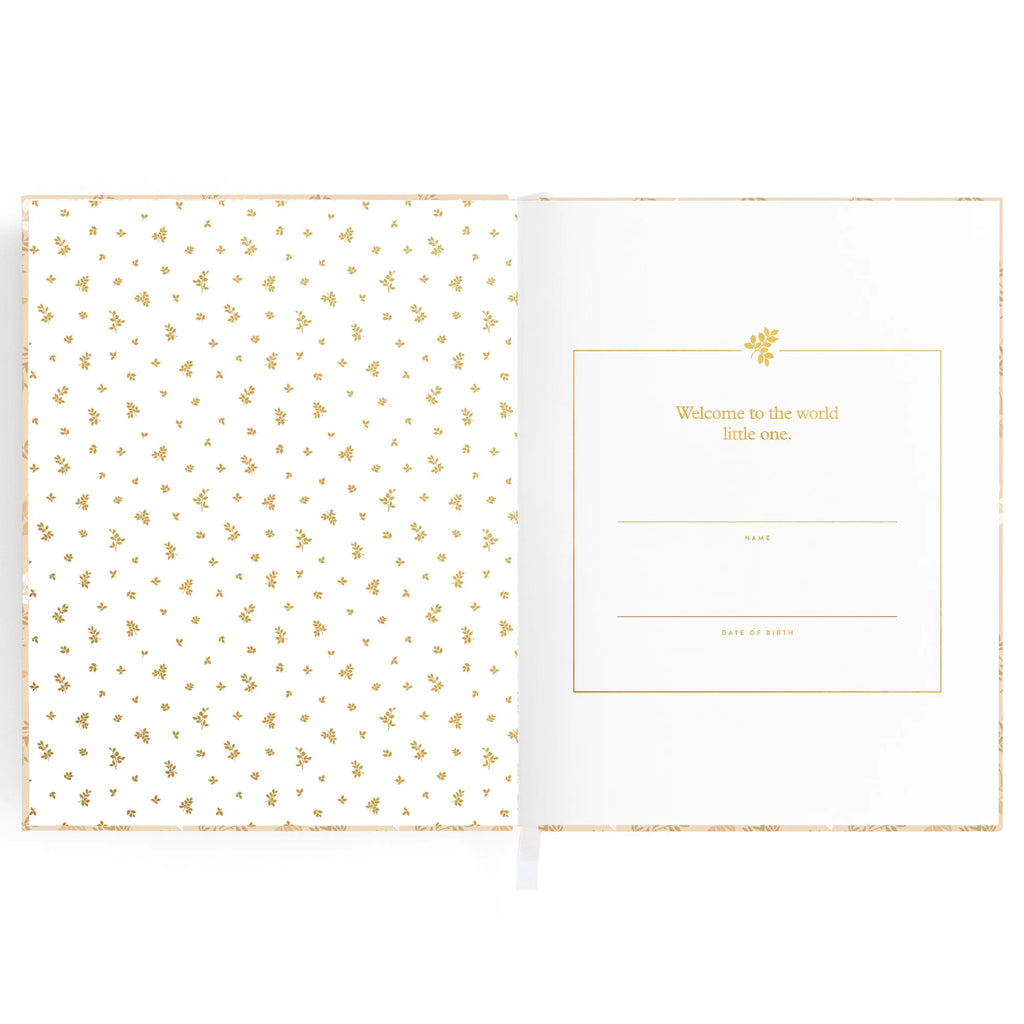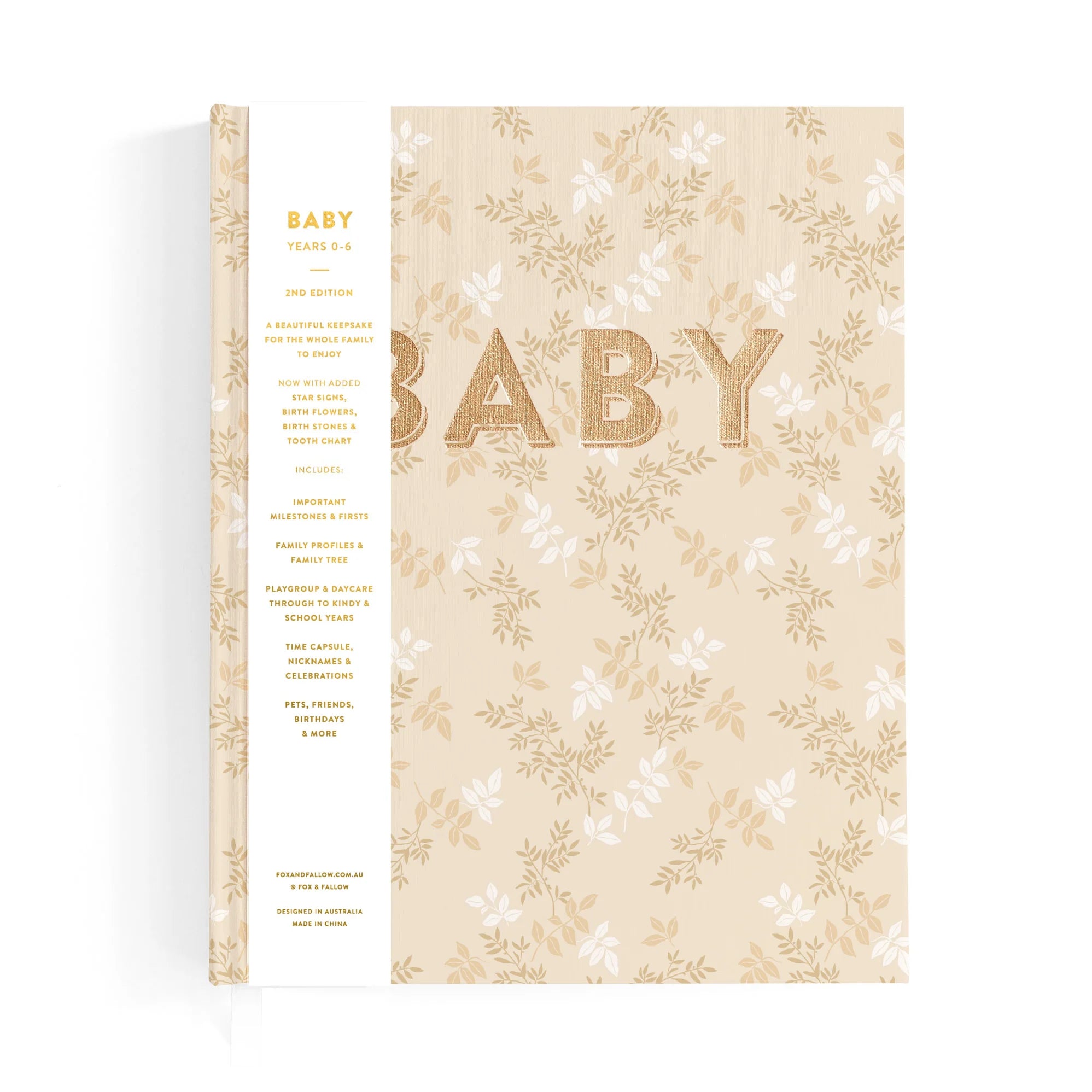 220 x 280 mm (15mm spine) / 8.6 x 11 inches (0.59 inch spine). Gold foil stamped printed linen cover. White grosgrain ribbon. 2mm foil stamped hard cover, lay-flat binding. Gold foil end pages and premium 115gsm FCS-certified acid-free paper. Packaged in a cello sleeve with gold foil bellyband. Designed in Australia, printed in China.