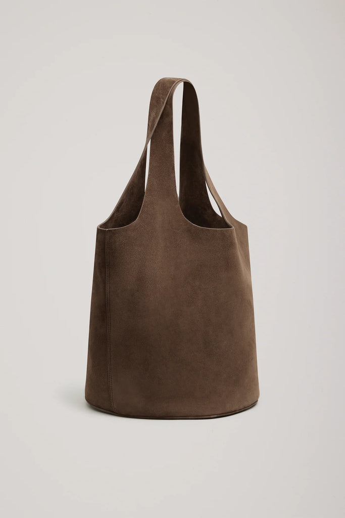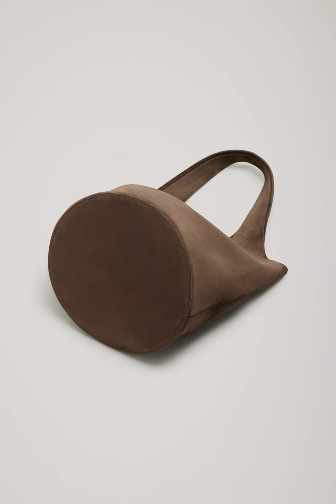 The Timms Bag is a sculptural take on the classic bucket style, crafted from premium suede leather. Designed with a circular base finished with a piped edge, its generous proportions offer ample space while maintaining a refined silhouette.