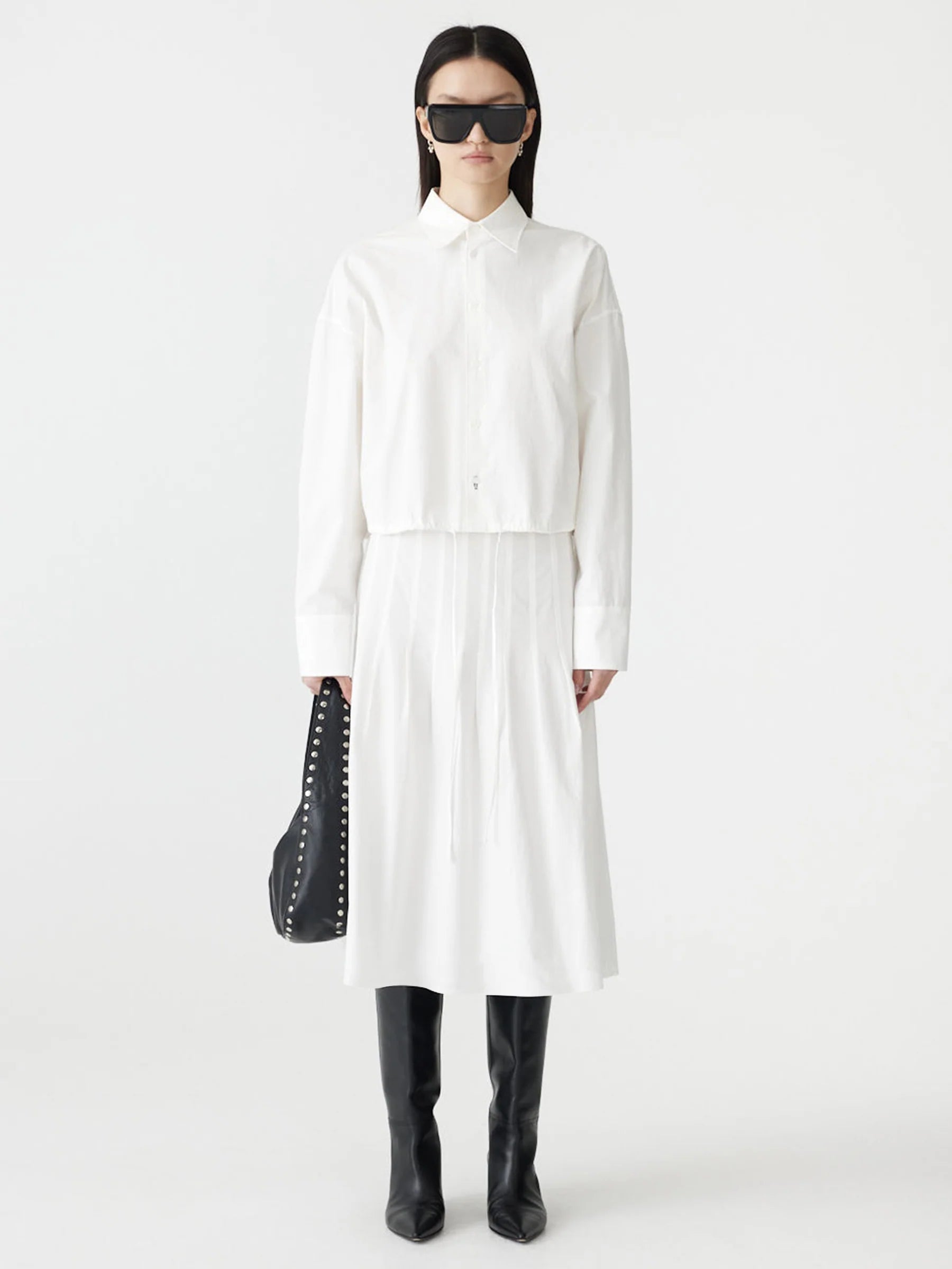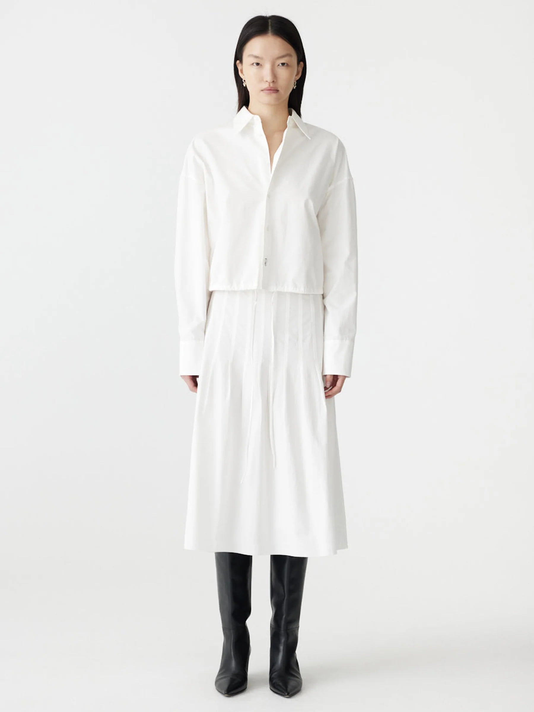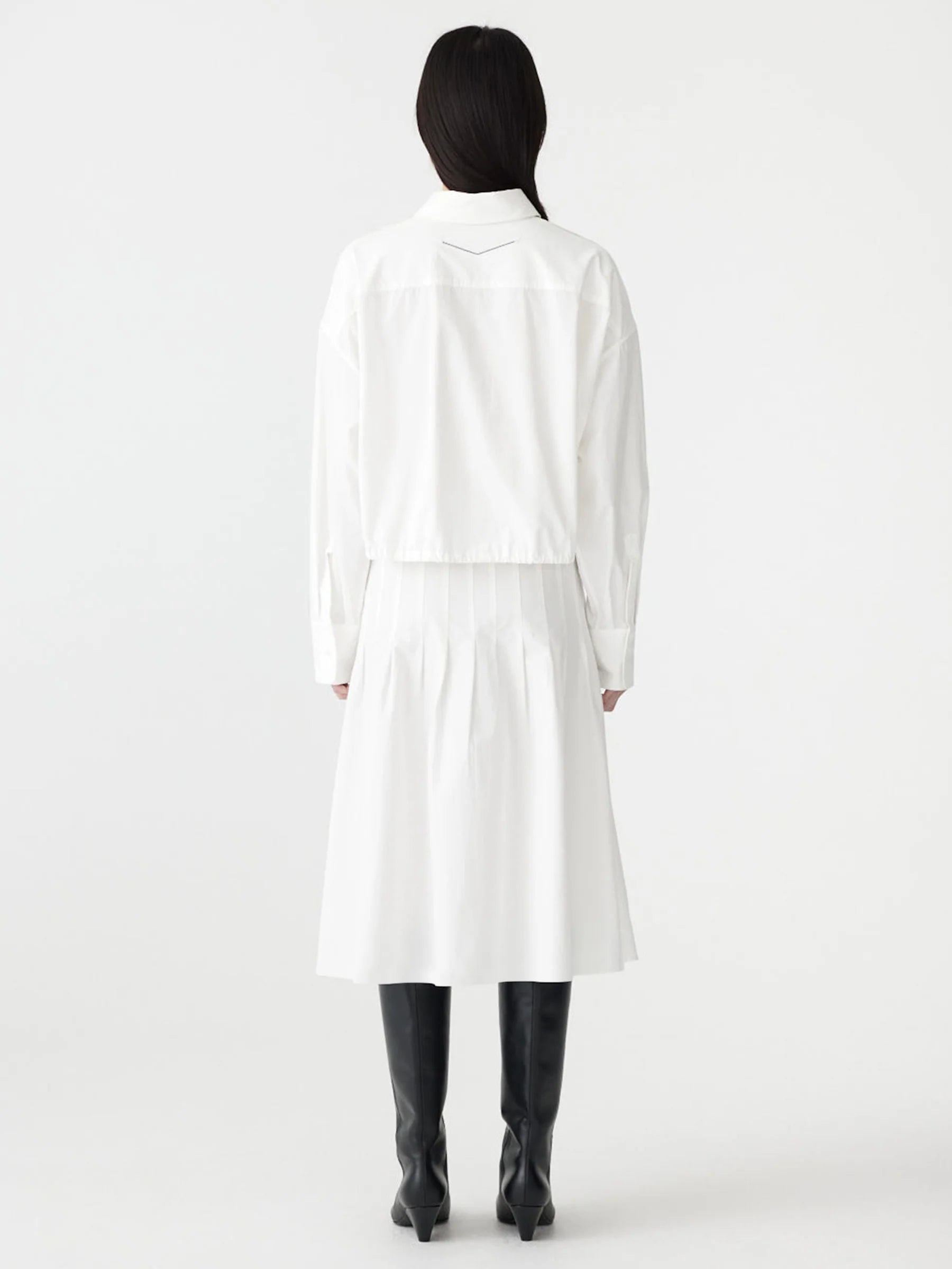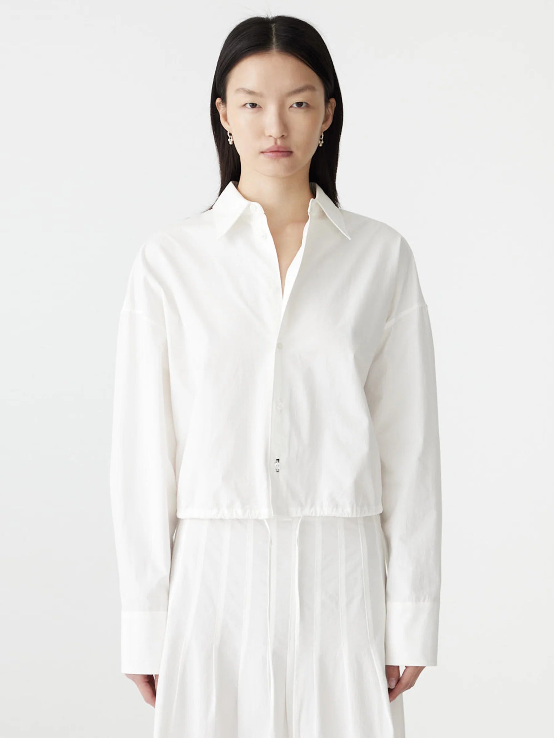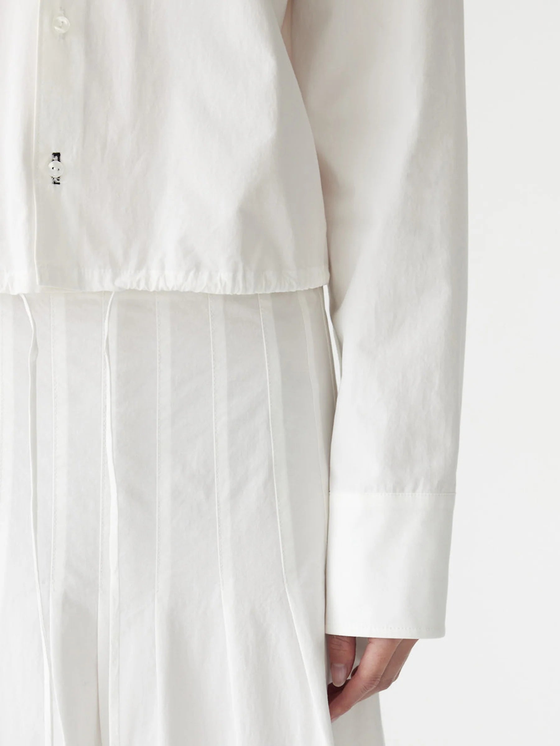 The Crushed Cotton Gathered Shirt is designed in a boxy, cropped silhouette with a drawstring hem that can be cinched for adjustable shape. Featuring a front buttoned placket with a concealed snap at the hem and a double-layered back yoke for subtle structure. Crafted from lightweight compact cotton with a natural crushed texture.