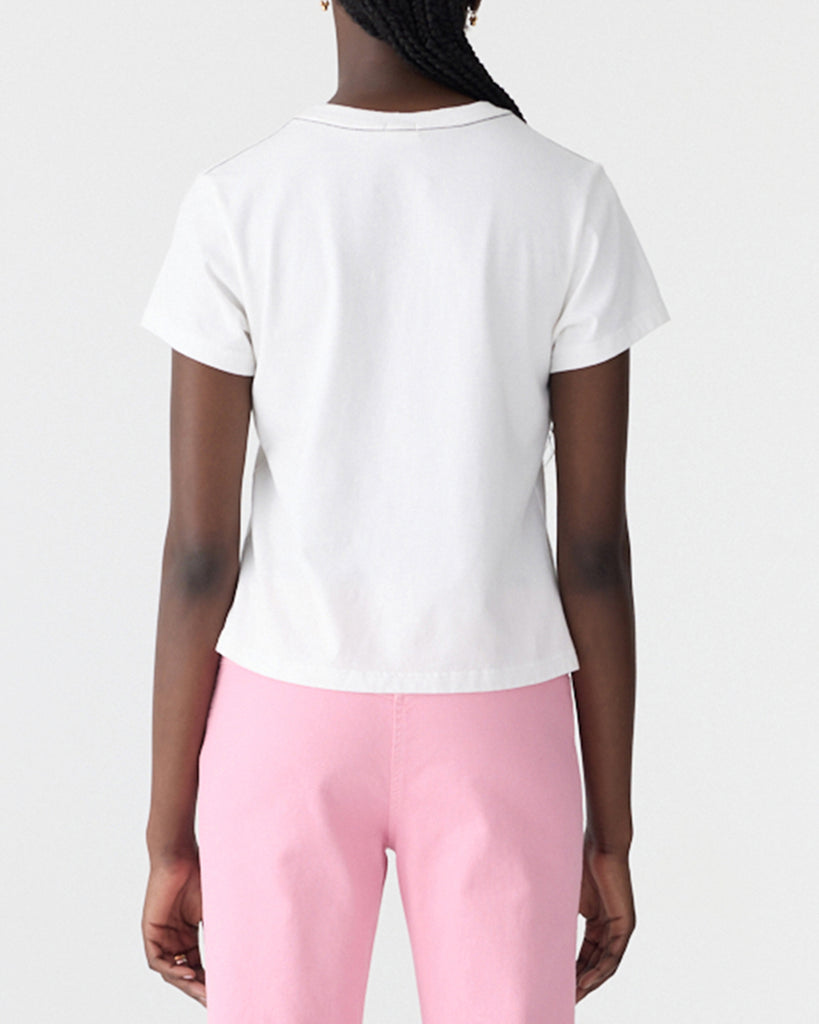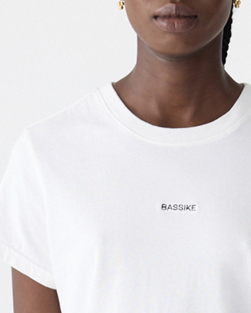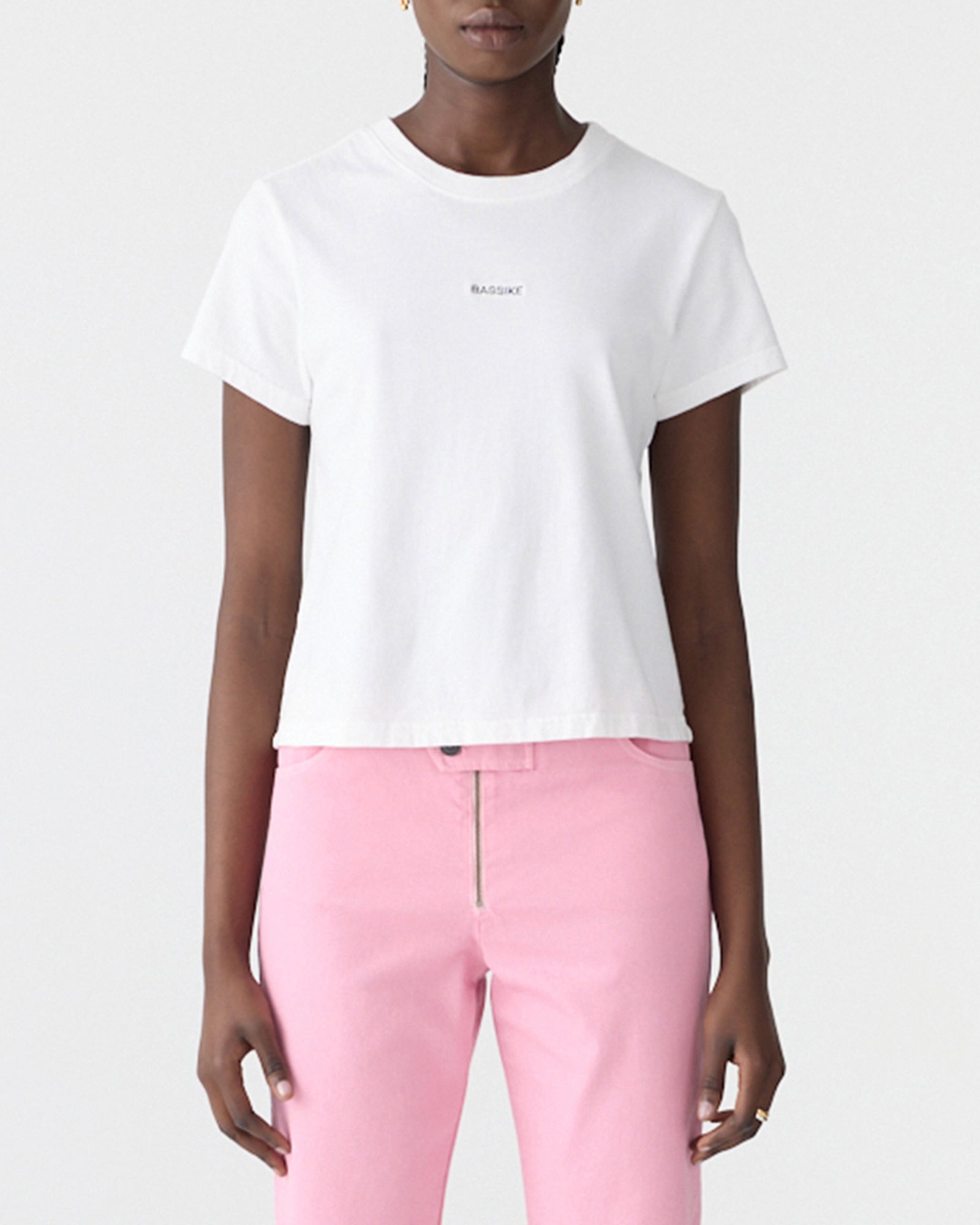 Classic crew neck in organic cotton rib, cap sleeves and a cropped silhouette. Features Bassike chainstitch at the back and centre front Bassike logo embroidery.