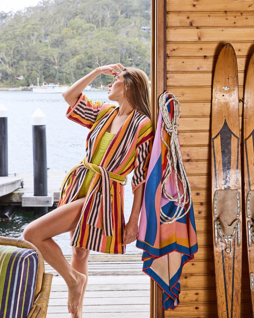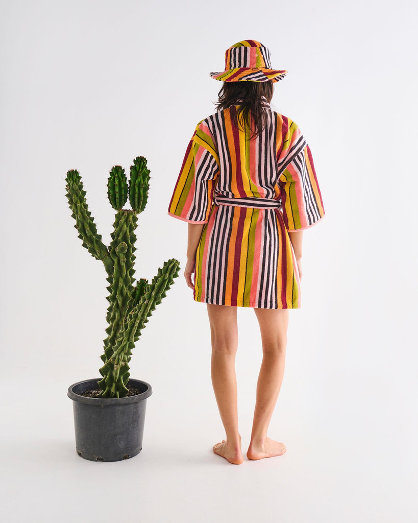 Wrap yourself in the sweet embrace of the Kip & Co Casablanca Stripe Terry Mini Bath Robe, the ultimate post-swim, post-shower, feel-good favourite. Made for beach days, bath nights and everything in between, it’s soft, snuggly, and seriously comfy. With its easy-breezy length and plush cotton feel, it’s perfect for salty shoulders, steamy bathroom bliss or lounging like a pro. Made from 100% cotton terry featuring a striking striped pattern in black, white, pink, orange, red and mustard green, it's like a wearable towel, but so much cuter! Beach babes, this ones for you.