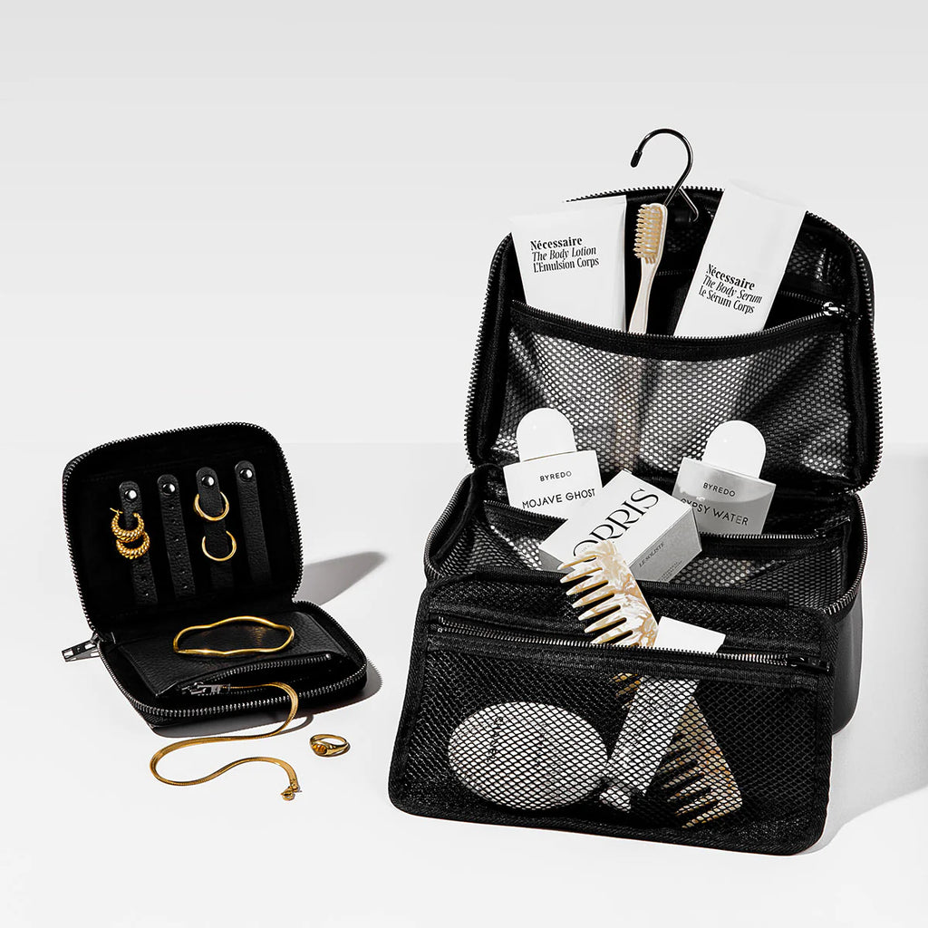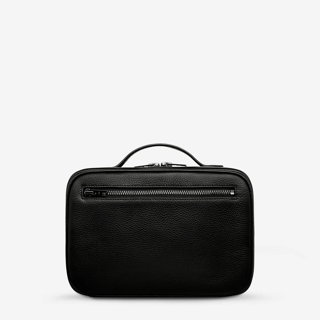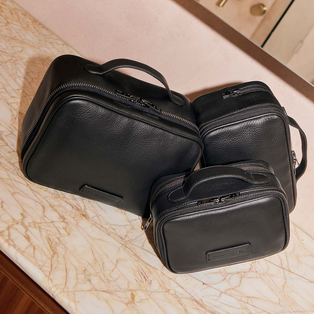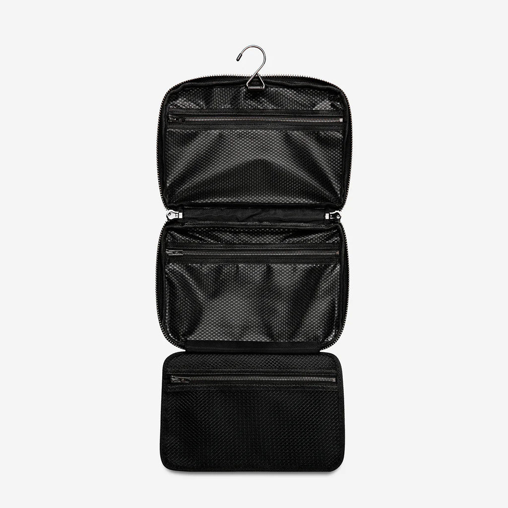 The big daddy of toiletries/makeup bags. 'Father Away' unzips to open out into 3 sections, either flat on a table or hung on a hook. The main large water resistant zone is made to house the bulk of your toiletries, above that is a medium-sized water resistant section for makeup and brushes etc, whilst the 3rd fold out flap is made to house other small stuff like hair clips, nail scissors / file, lipsticks etc. On the outside is an easy-access back zipper pocket and top handle.