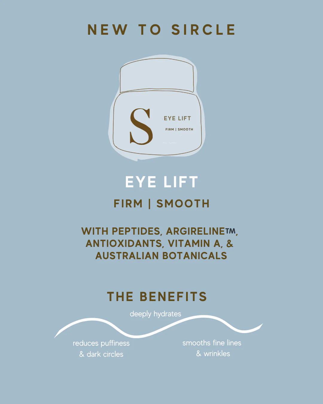 SIRCLE Eye Lift is a targeted eye lift cream to smooth, firm, and brighten tired eyes. It is formulated with Argireline, Rosehip CO2 oil, potent antioxidants, and Australian botanicals to visibly reduce puffiness, dark circles, and fine lines, while deeply hydrating the delicate under-eye area.