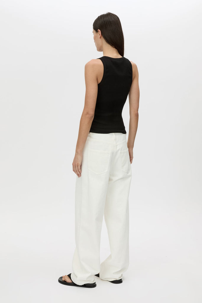 Nora fitted scoop neck black tank top in a stretchy cotton blend and quarter corozo button placket.