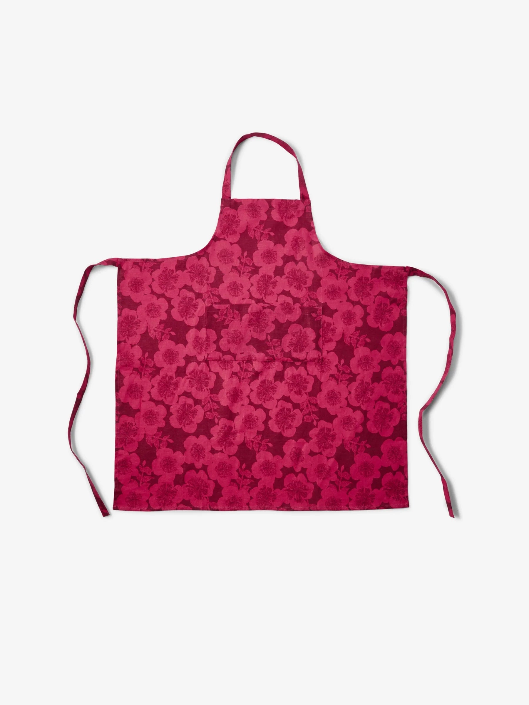 Bold cerise pink florals burst across linen, making this apron a vibrant choice for creative kitchens.
