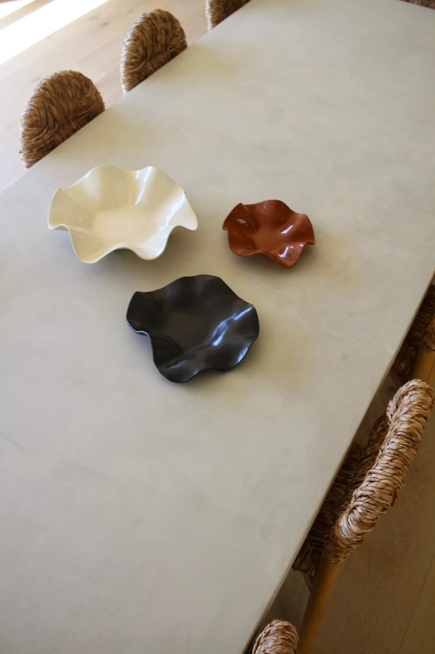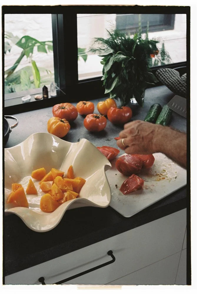 A hand made ceramic wavy bowl was crafted using a white stoneware clay topped with a clear gloss glaze on the inside. Perfect for housing produce, home cooked meals or sitting as a sculptural statement piece in your home setting.