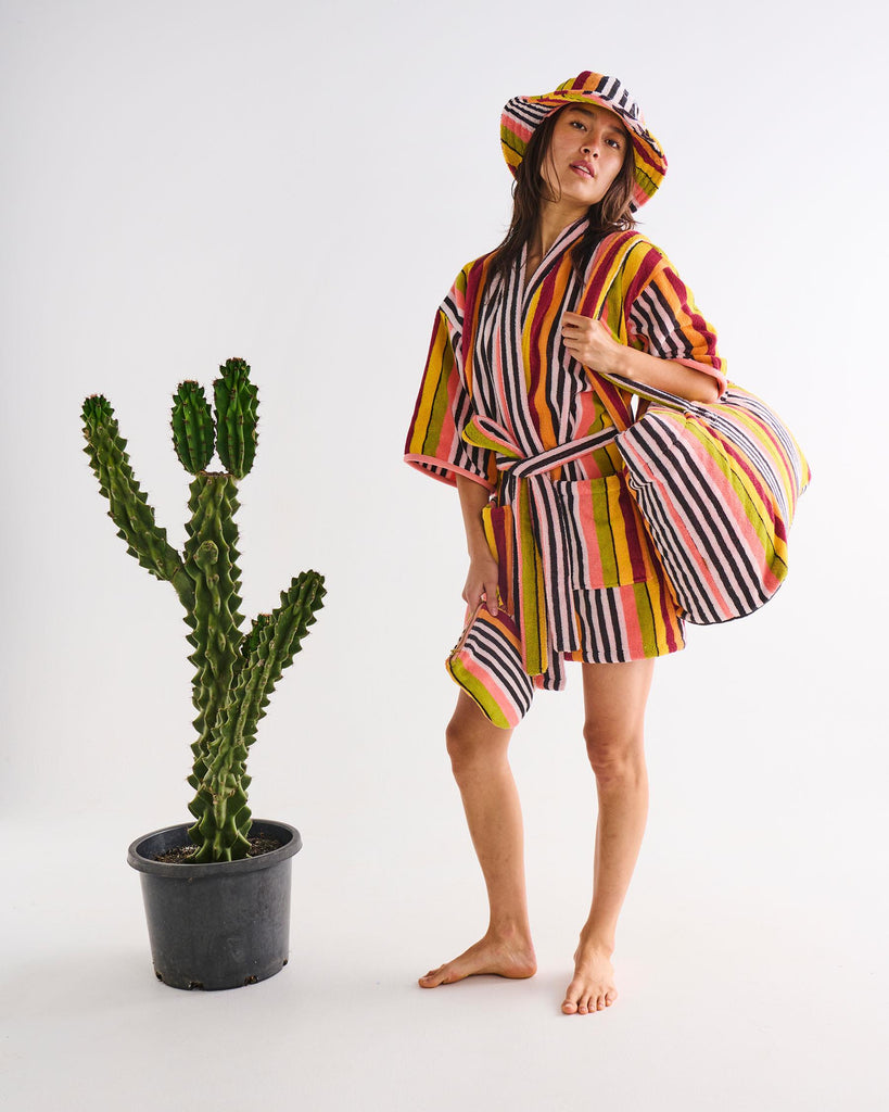 Meet your ultimate summer sidekick, the Kip & Co Casablanca Stripe Terry Oversized Beach Bag. This big beauty is built for beach days, poolside hangs and everything in between, with room for all the essentials (and then some!). Towel? Tick. Togs? Tick. Snacks, drink bottle, sunscreen...tick, tick, tick. Made from easy-care 100% cotton terry with thick, comfy straps for slinging over your shoulder, itās your throw-it-in-and-go kind of bag. Featuring a striking striped pattern in black, white, pink, orange, red and mustard green. Summer is a breeze with this bag by your side. Ā