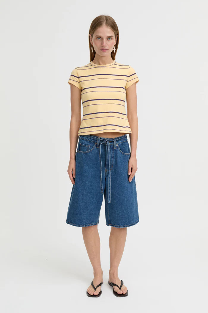The Aerin Baby Tee in butter yellow elevates the classic fitted silhouette with refined simplicity. Crafted from soft, stretchy cotton, it hugs the body with a flattering shape, while the crew neckline and short sleeves keep it versatile. Pair with the matching Aerin Shorts or layer under oversized shirts and jackets for a polished, everyday finish.