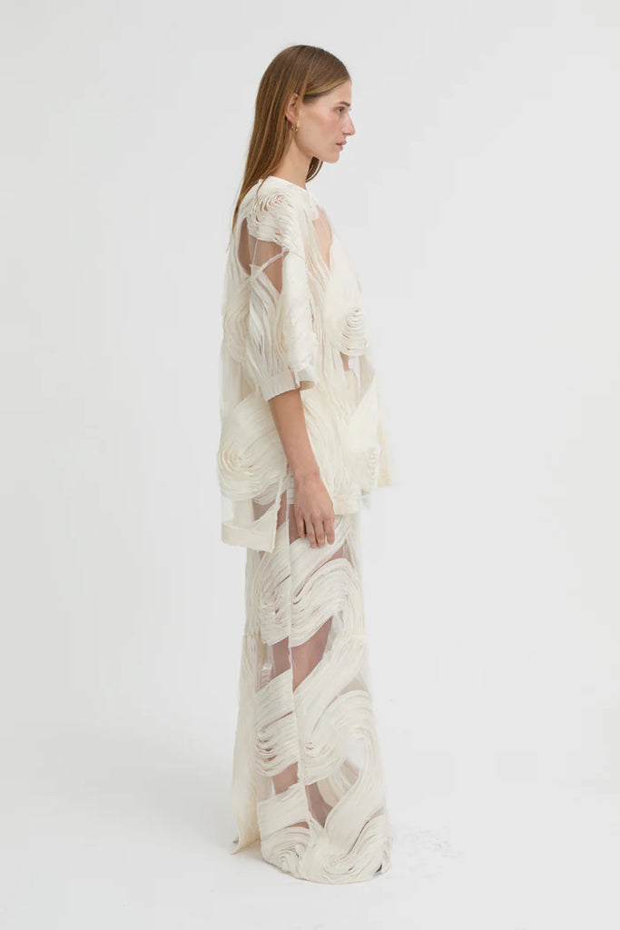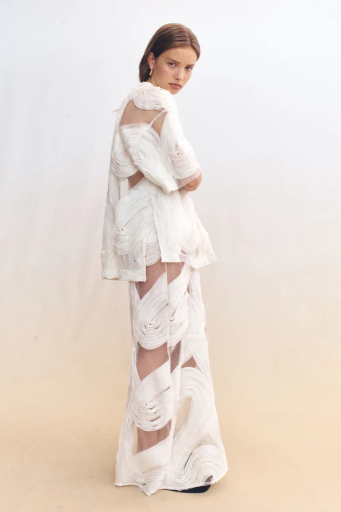 The Delmare Skirt in Ivory sweeps the floor with effortless ease. Tonal embroidery traces the silhouette, a quiet detail that draws the eye without demanding attention. A semi-elasticated waistband allows a natural, comfortable fit, while the sheer base lets the skirt float and shift with each step.