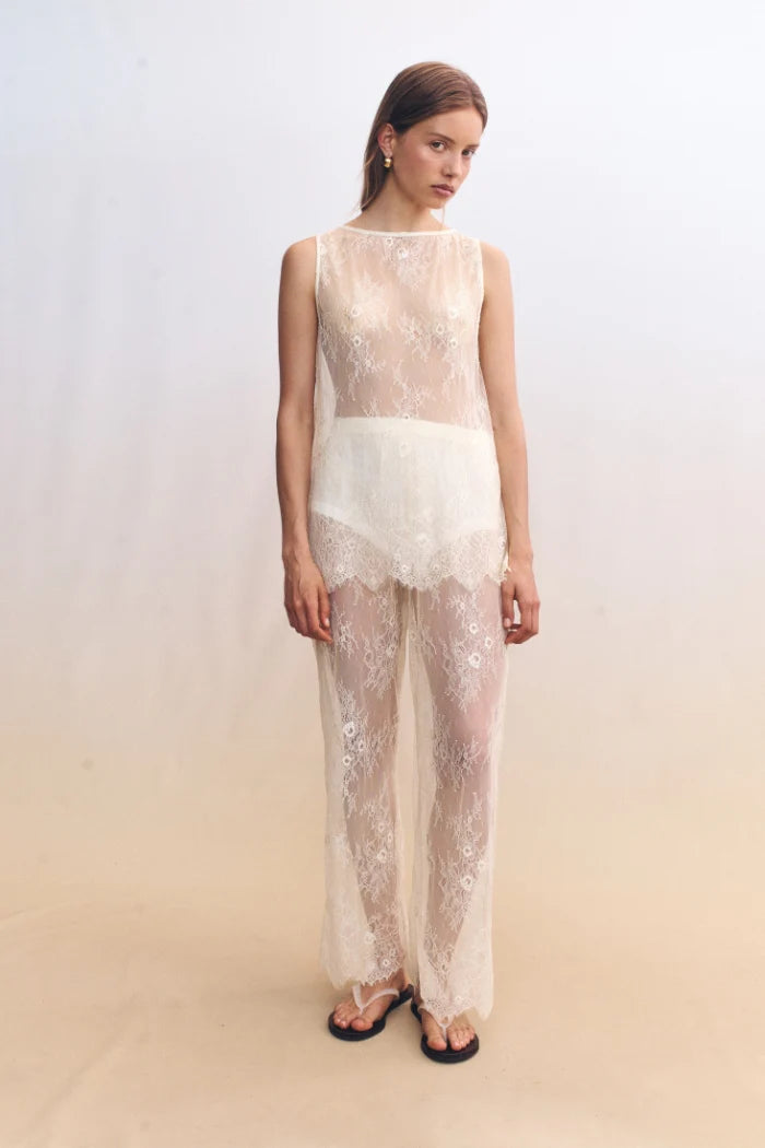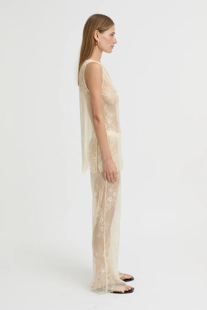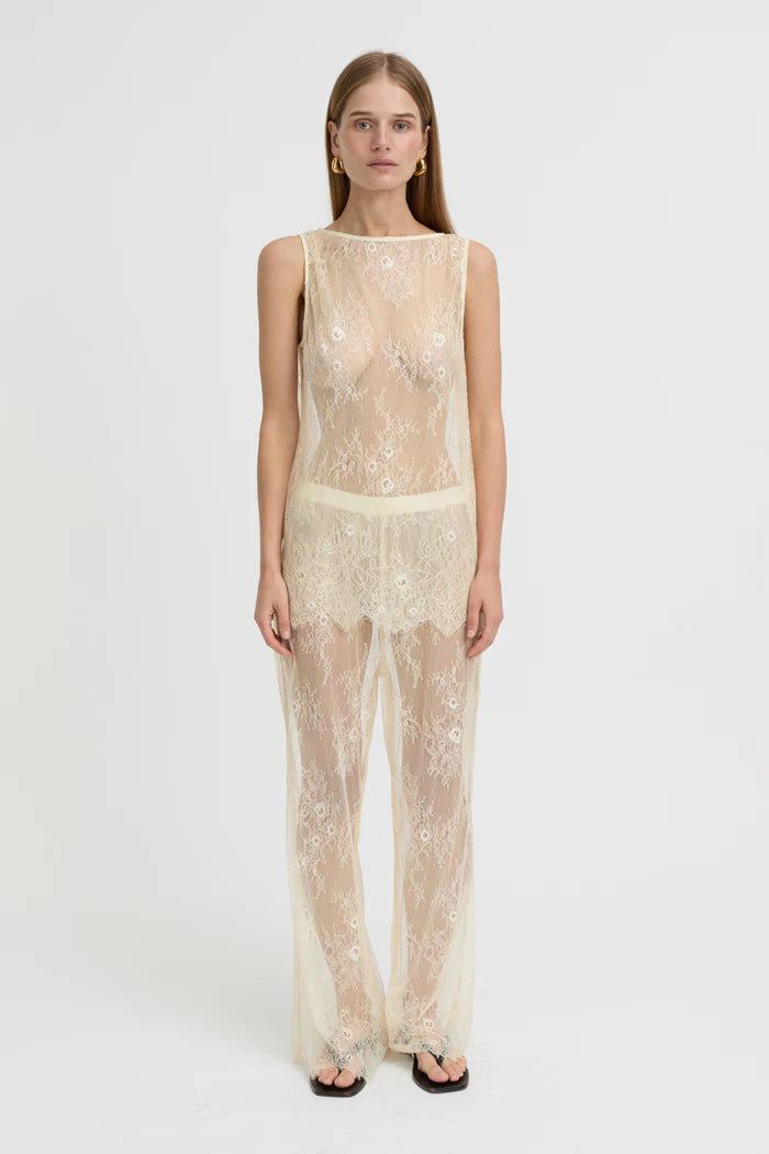 The Riven Tank balances delicacy with quiet intent. Crafted from sheer floral lace in a soft ivory hue, this sleeveless silhouette skims the body with ease. The high bateau neckline and longline fit offer understated structure, while the intricate embroidery brings depth and dimension to its transparency.
