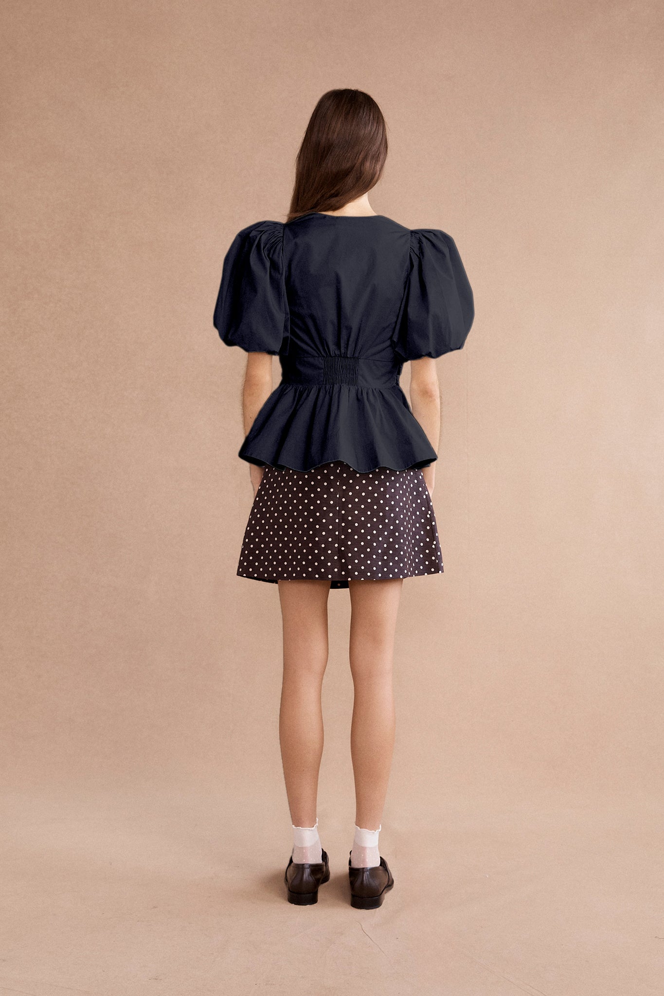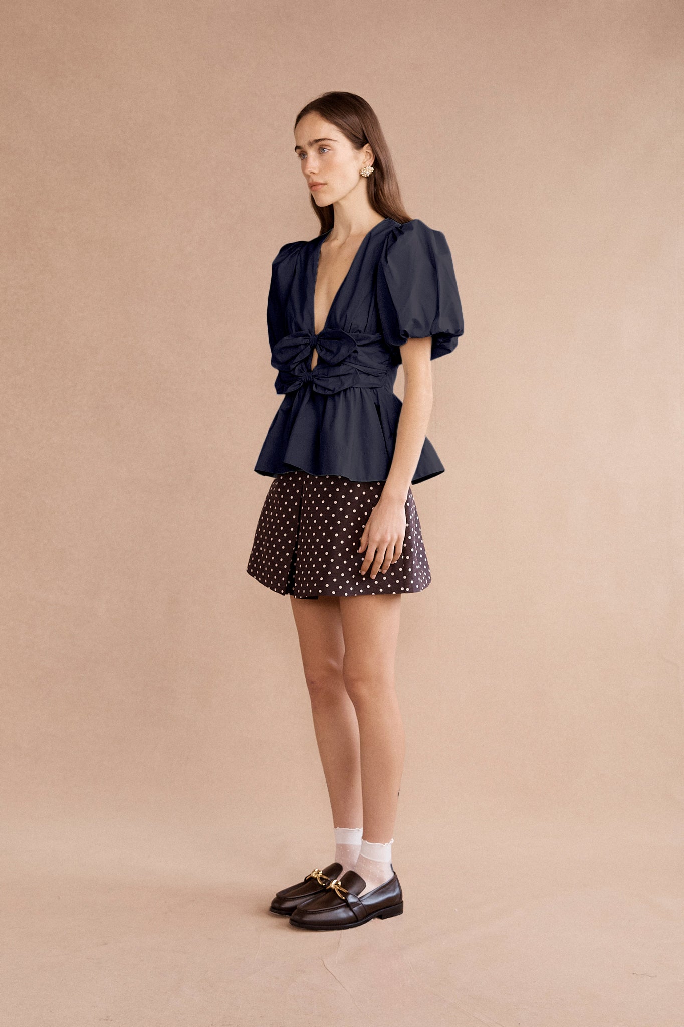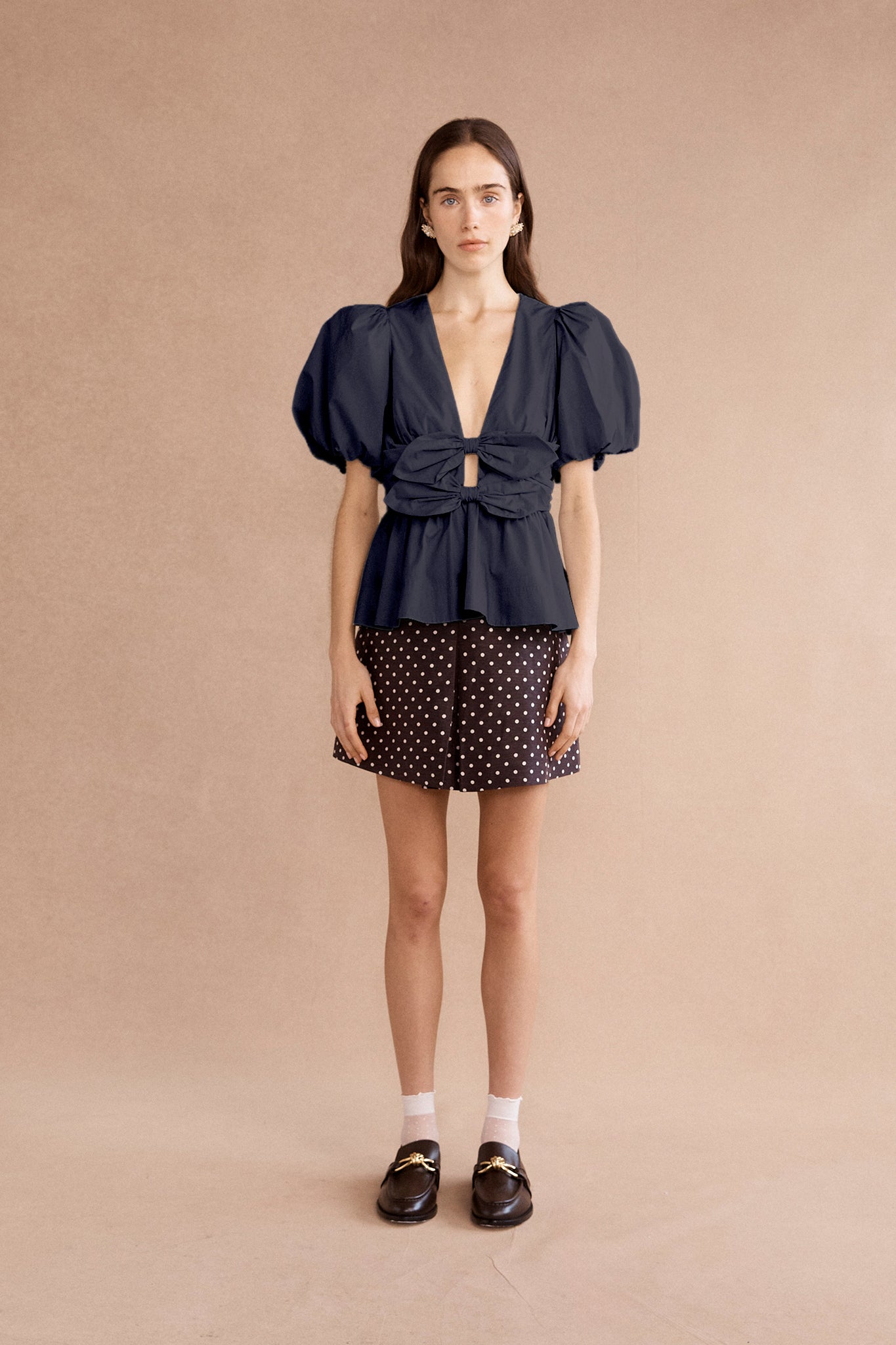 The Lovaan Devon top in ink is made from butter-soft cotton poplin, featuring double bow front details, blousy puff sleeves and a flattering deep V-front neckline.