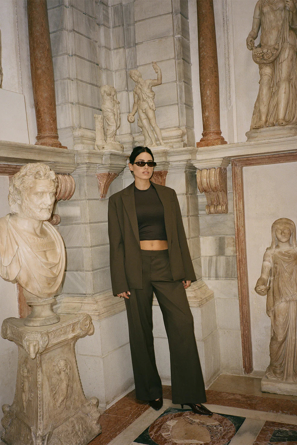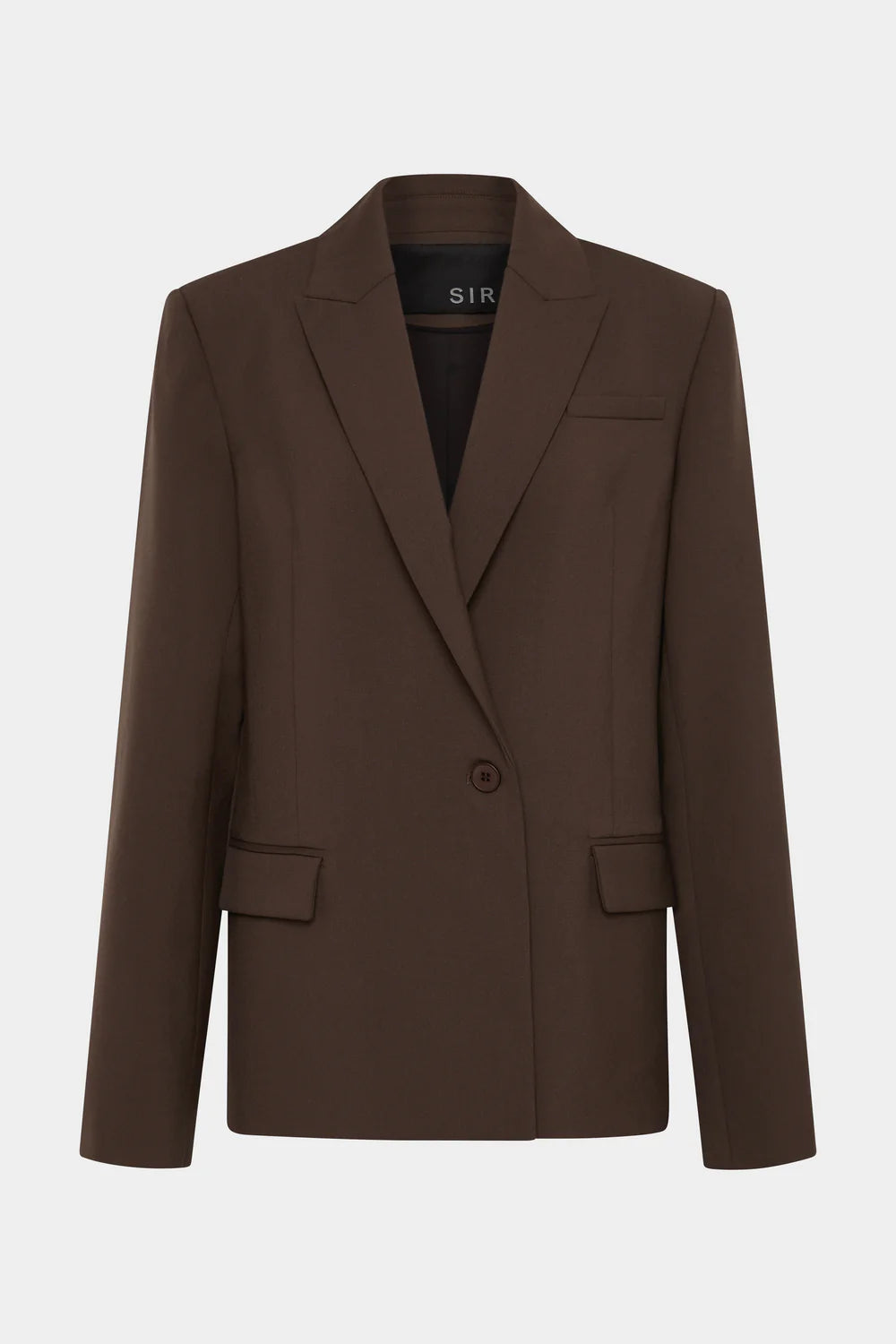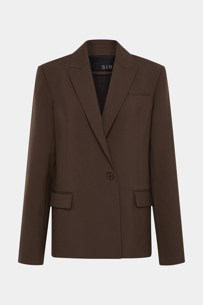 The Dylan Blazer in Chocolate is an oversized, single-breasted blazer designed with padded shoulders for a structured and defined silhouette. Tailored in midweight wool suiting.