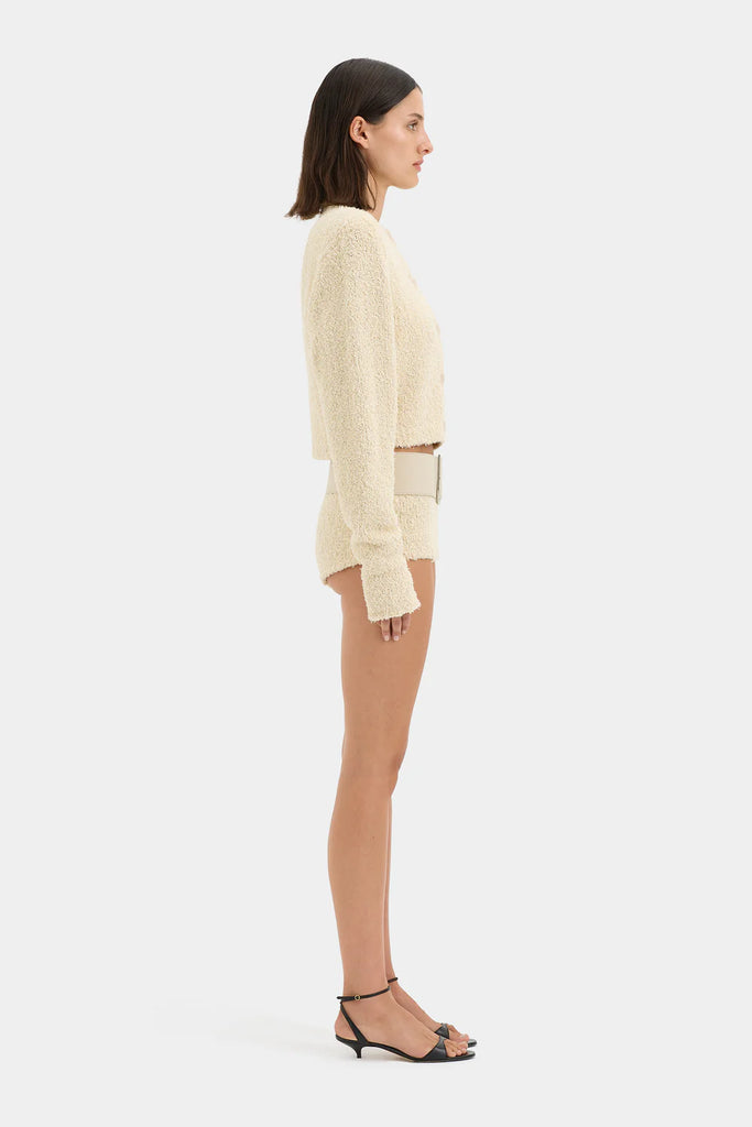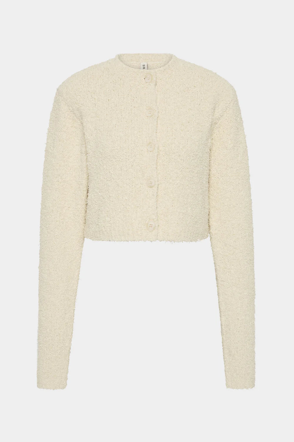 The Tropicana Cardigan is crafted from textured bouclé yarn with generous stretch. Designed to be slightly cropped, it features a button front, tonal buttons and removable shoulder pads for versatile wear.