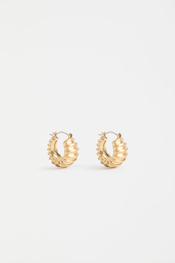 The Ellin Hoop Earrings are a thick, small hoop style with horizontal ridges along the exterior that have been brushed to create further texture. The compact size and lightweight design ensure comfortable everyday wear, while the textured design adds unique interest that is perfect for adding a sophisticated touch to casual and professional looks.