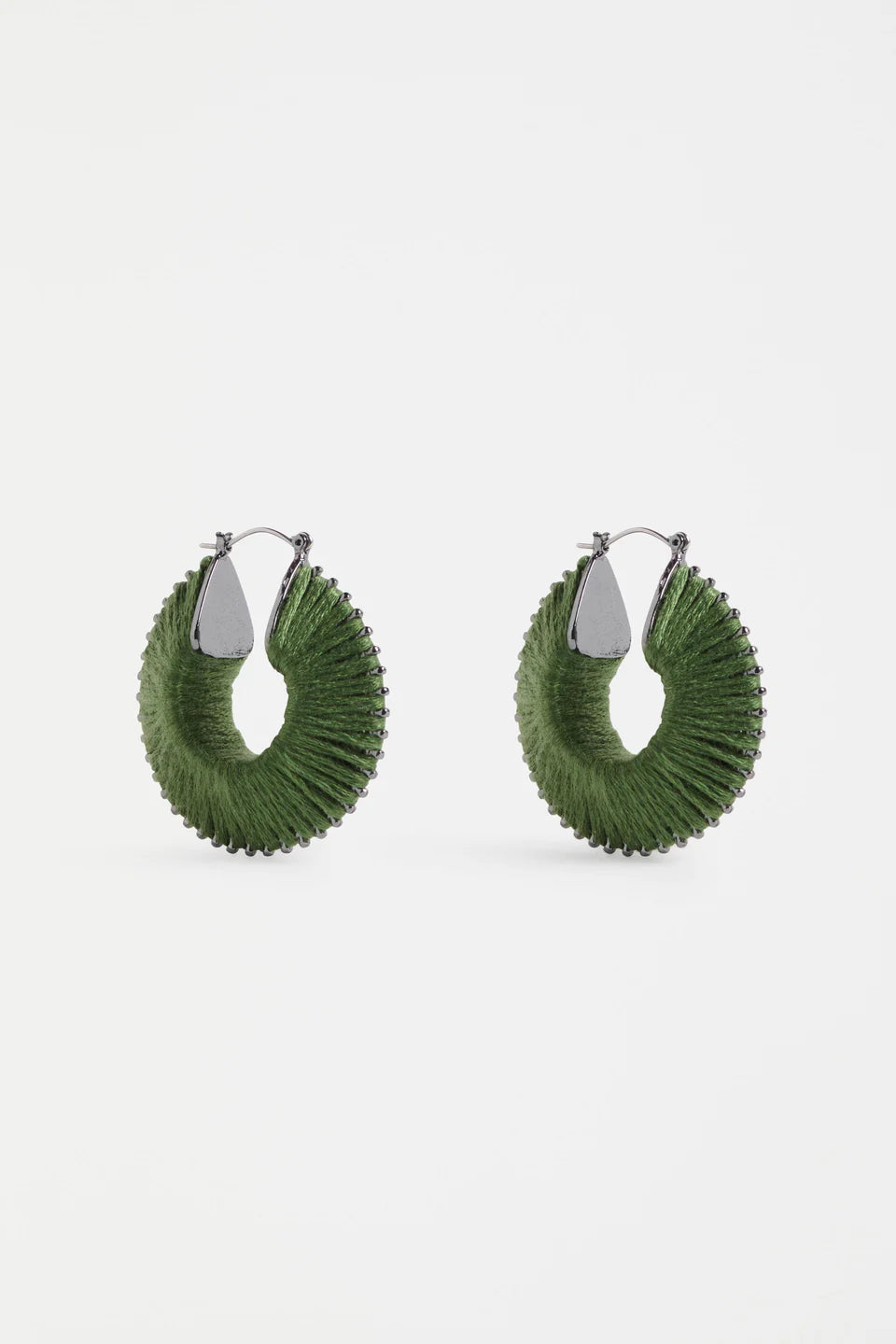 The Ledde Hoop Earrings are thick mid-sized metal hoops with colourful thread wrapped throughout in a sunray-like formation creating a unique textural look. The artisanal construction will add personality to any outfit, from casual to more elevated looks.