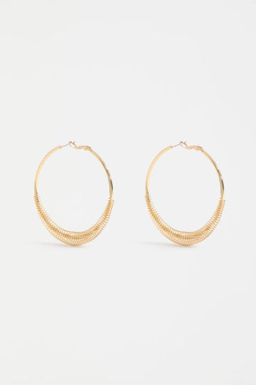 The Solf Metallic Hoop Earrings showcase a classic large metal hoop with a spring coil feature looped through the hoop, creating a large yet lightweight design. Elevate and add personality to your day or evening outfits with these special hoop earrings.