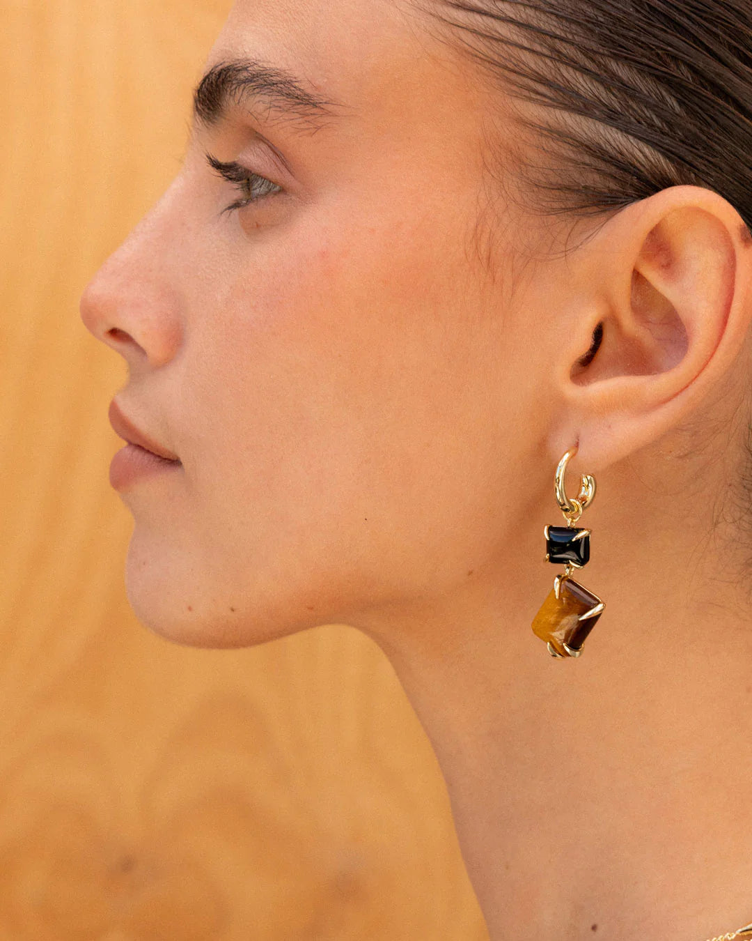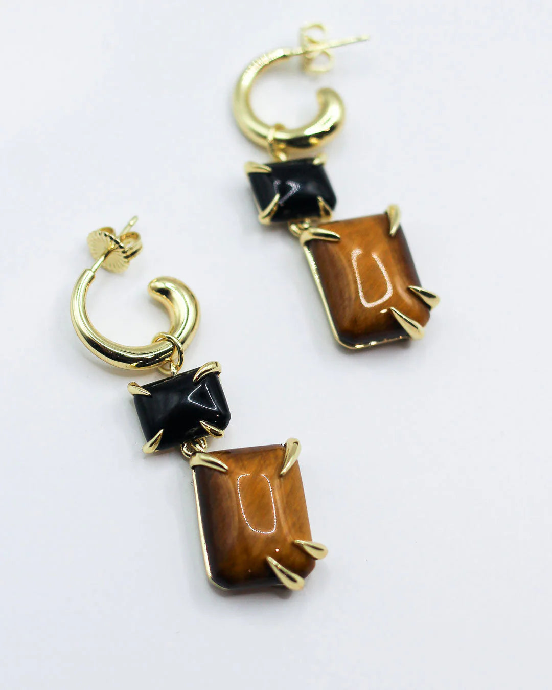 The F+H Studios Double Drop Claw Earrings are an F+H essential. An update on one of their favourite designs with cabochon cut natural onyx and tiger's eye gemstones for classically-cool styling. The custom-cut gemstones are set in an F+H signature over-sized claw settings and suspended from an easy-to-wear hoop, making these earrings perfect to wear from day to night.