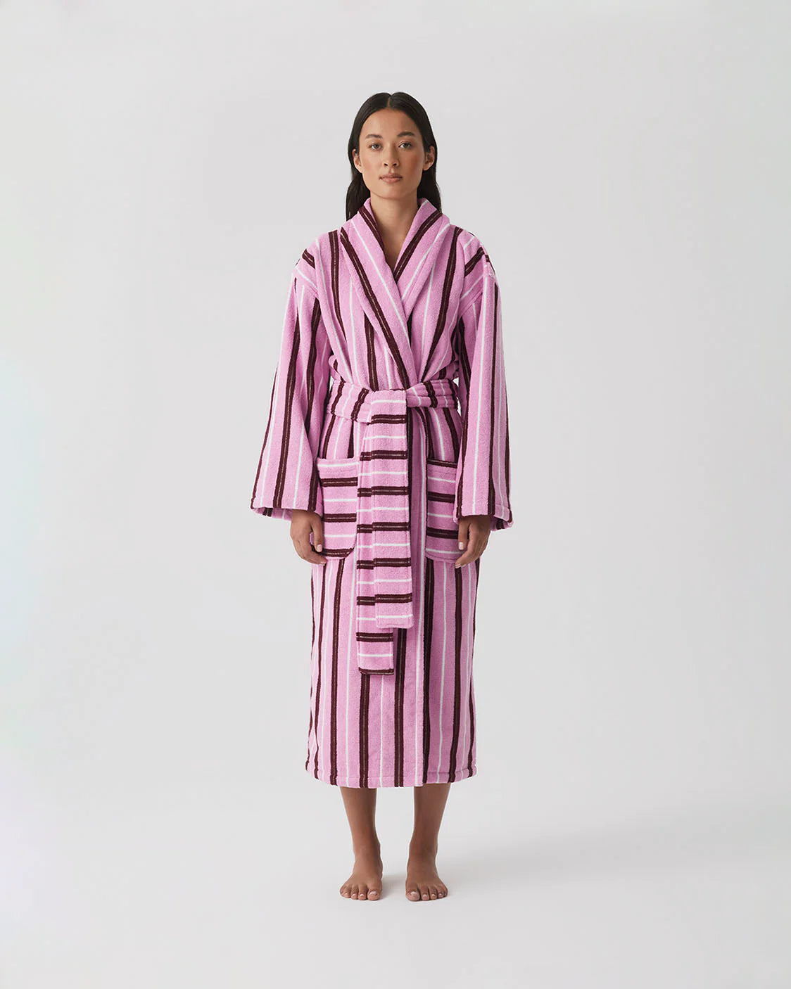 The Hommey Robe in Fuchsia. The Hommey Robe is designed for the gentle rituals of home—unhurried starts, easy evenings, and every quiet moment in between. Crafted in yarn-dyed stripes with a relaxed boxy silhouette, it brings a familiar softness to your daily rhythm while looking perfectly put-together.