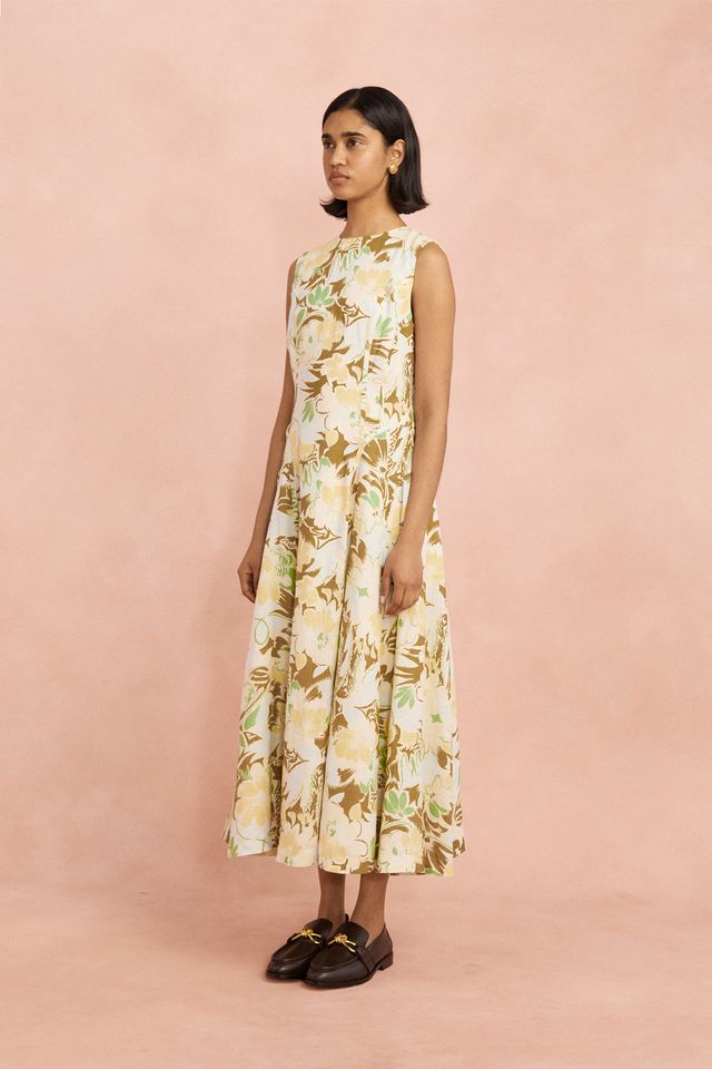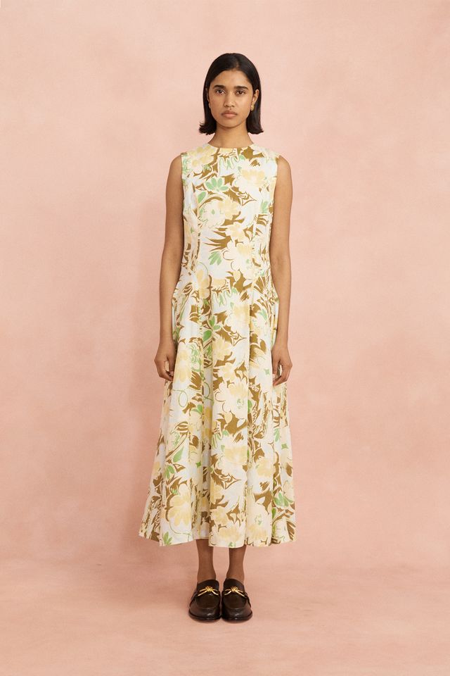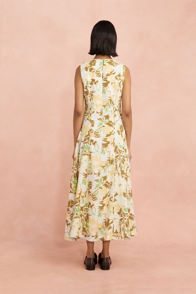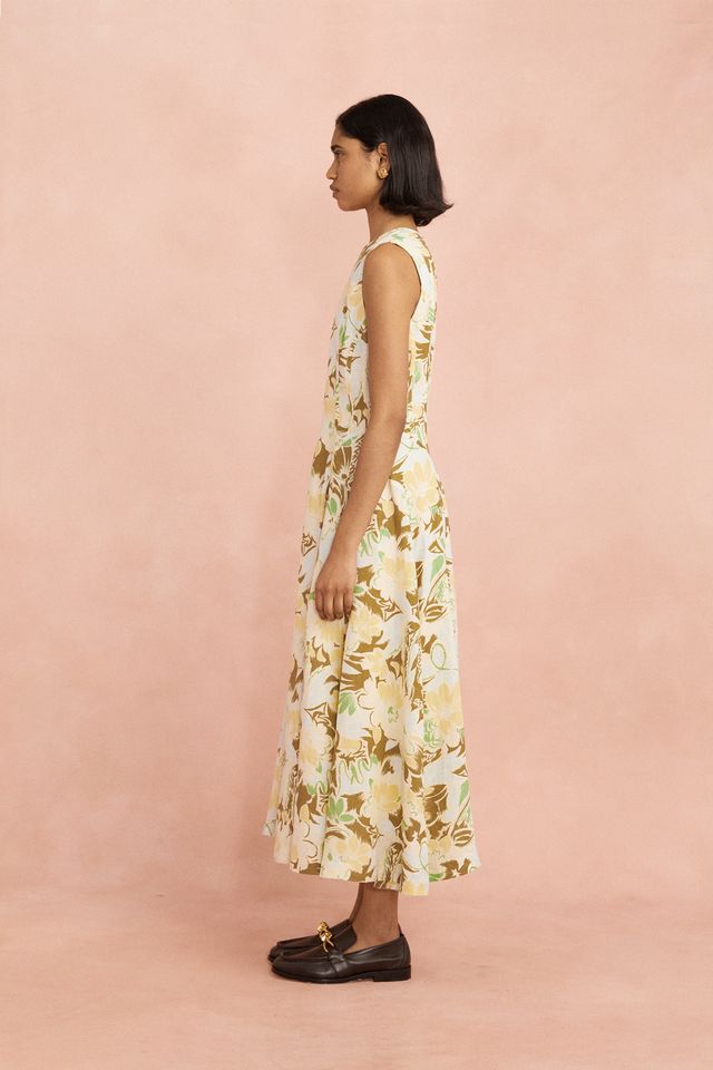 The Lovaan Pollyanna Midi Dress in Hilary Print is a soft statement piece. Crafted from a premium cotton-linen blend, this sleeveless silhouette features subtle shaping through the bodice, a high round neckline, and a full A-line skirt that falls elegantly to the ankle. The all-over painterly floral makes it a standout option for garden parties, long lunches, or days you just want to feel special.