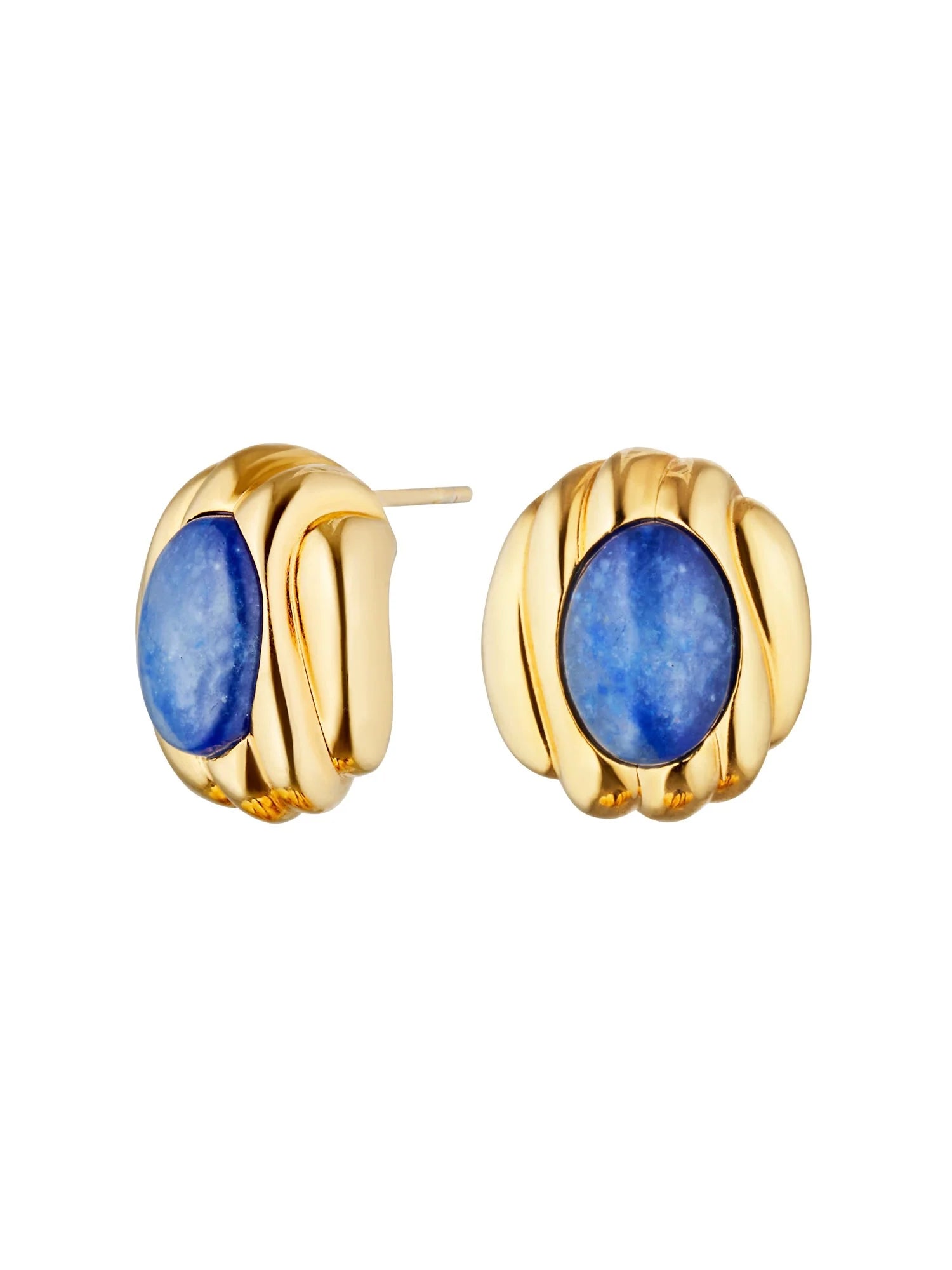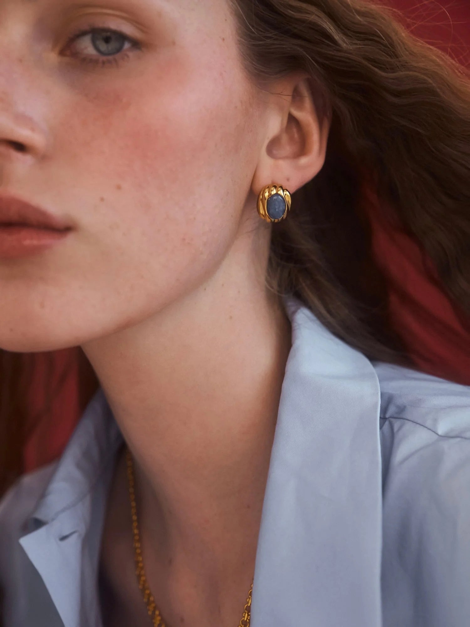 The Gia Earrings are 80s-inspired earrings that feature a bold and striking design with 18k gold plating and smooth, oval Blue Aventurine stones set in a textured, organic frame. Their retro aesthetic evokes a sense of vintage luxury and timeless elegance.