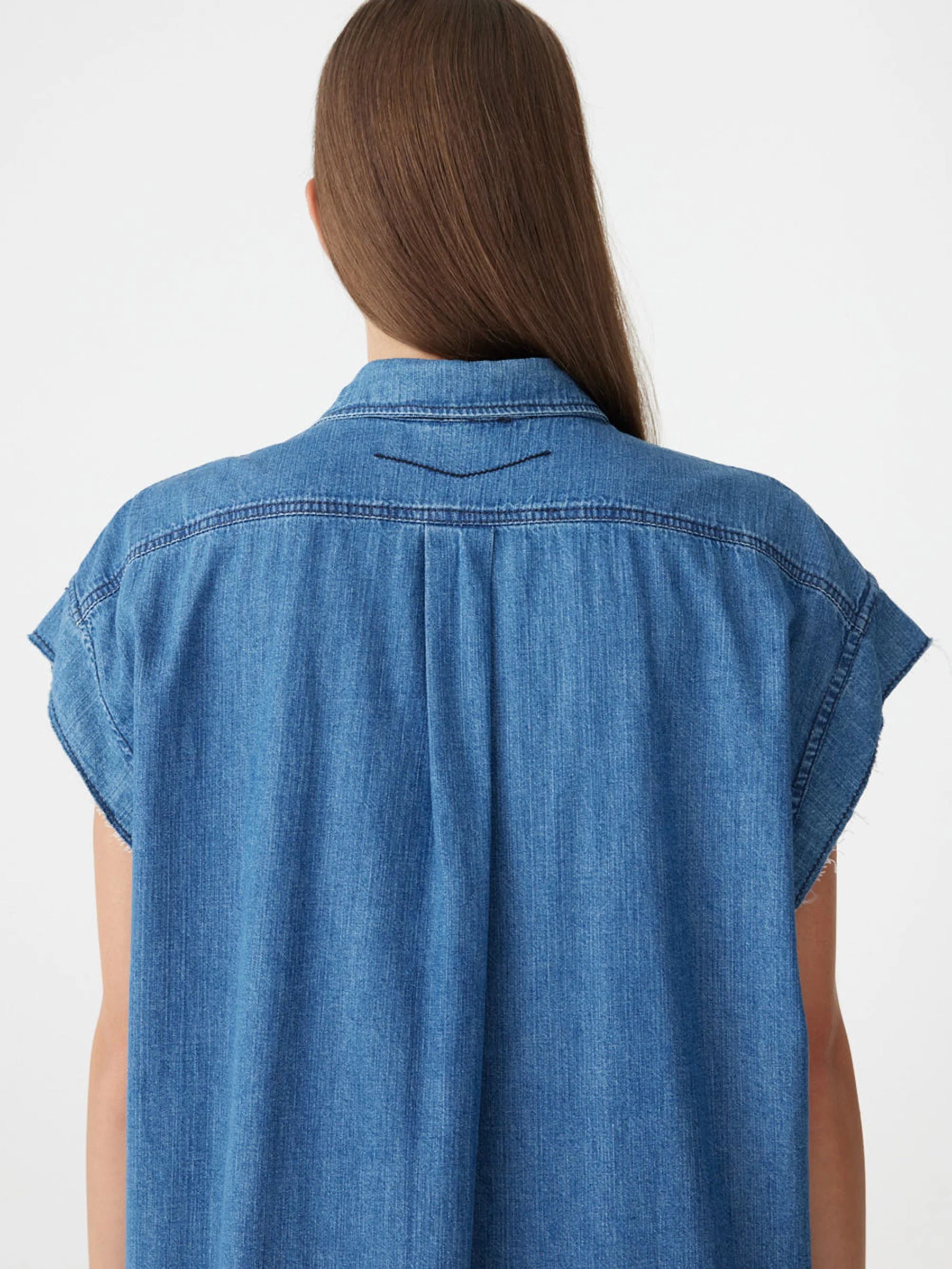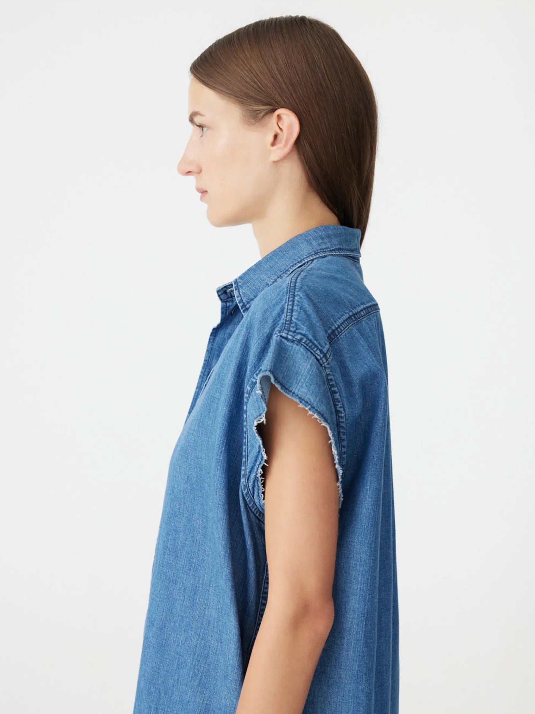 Crafted from lightweight organic denim cotton made in Japan, the Organic Denim Sleeveless Dress is designed for a relaxed fit. Featuring a buttoned centre-front placket and collar, with raw sleeve hems. Finished with a double-layered back yoke, side-entry pockets and tonal topstitching throughout.