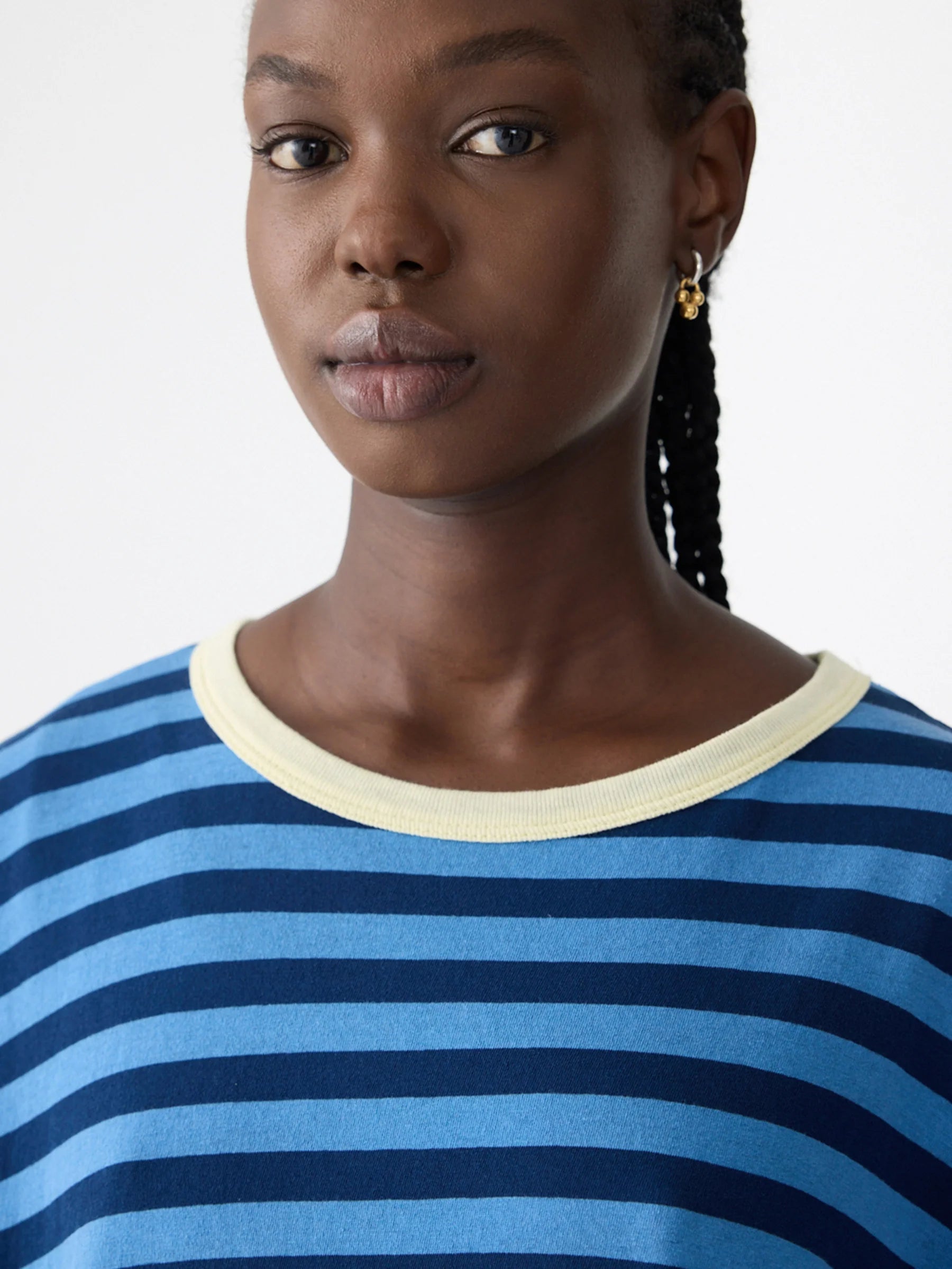 A new classic in lightweight organic cotton single jersey. The stripe Boyfriend T-Shirt is a foundational wardrobe element relaxed by dropped shoulder seams and a slouched silhouette. Refined by a contrast rib heritage neck bind and side split seams. Distinguished by signature Bassike contrast topstitching at back.