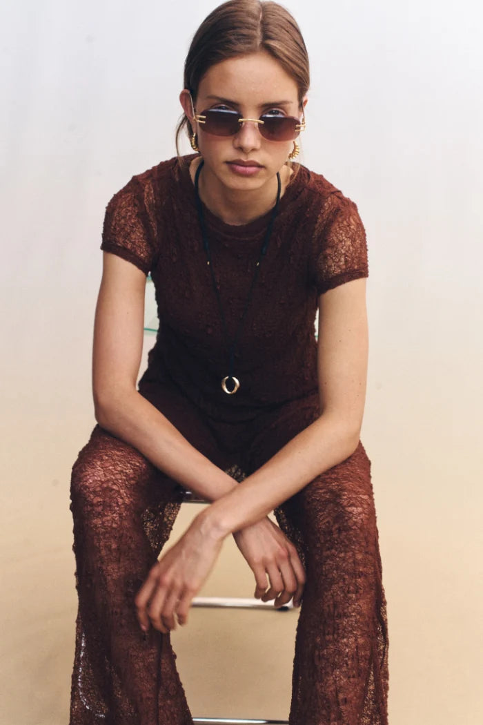 The Riven Baby Tee in brown reimagines classic lace with a contemporary edge. Fitted short sleeves and a soft crew neckline frame the rich, sheer floral texture, while its tonal depth adds a grounded, editorial feel. Pair under tailoring or style with high-rise bottoms for an off-duty look that feels considered yet effortless.