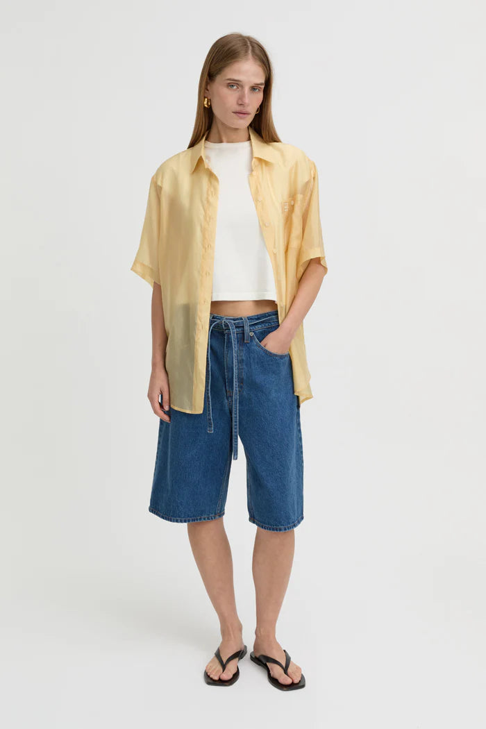 Elevate your off-duty wardrobe with the Tamsin Shorts in Blue. Designed from a structured cotton-blend, their high-rise, knee-length silhouette and belt-style drawcord create a polished yet relaxed finish. Ideal with a simple tee or shirt for versatile, everyday wear.
