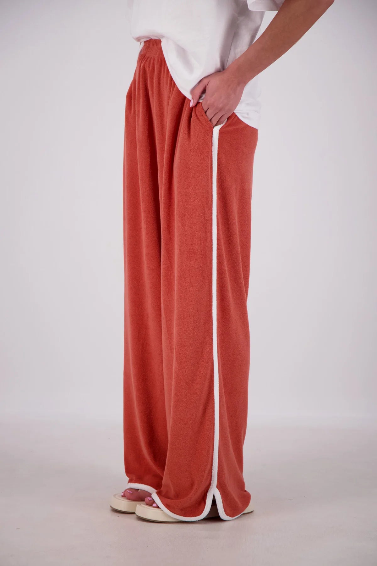 Ethically Made/ 100% Cotton Terry / Relaxed fit / 2 side pockets / Contrast stripe detail / Elastic waistband / Curved hem with side split / Designed to wash and wear / Measurements size small: Outer leg to split: 103cm / Inside leg: 77cm / 1/2 waist width (flat and unstretched): 33cm / 1/2 Hip: 56cm / Front rise: 29cm / Easy care Designed in Australia. Model is a small and wears a size small.