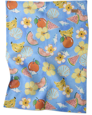 Add a splash of tropical cheer to your kitchen! The Kip & Co Paradise Found Tea Towel, crafted from a soft linen-cotton blend, is sprinkled with hand-drawn tropical fruits, flowers and seashells on a blissful blue base. Perfect for drying, serving, or simply adding a pop of colour, it brings playful personality and effortless summer style to every kitchen moment.Ā