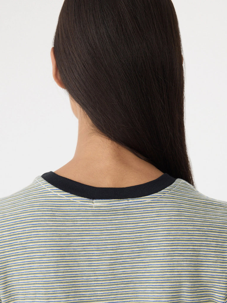 A high-rotation essential, the Stripe Raw Edge Baby T-Shirt is crafted from a lightweight recycled cotton jersey in a Japanese stripe. Designed for a slim fit with a cropped silhouette, this signature style features a classic crew neckline and cap sleeves. Finished with a raw edge hem and Bassike’s contrast stitch detailing at the back neck.