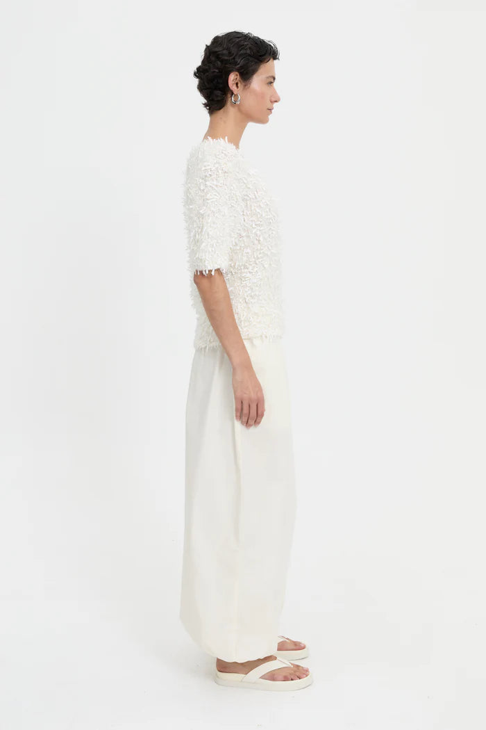 A textured short-sleeve tee in a relaxed, boxy silhouette. Crafted with a subtle frayed-effect finish, it features a wide neckline and mid-length sleeves for ease of movement.