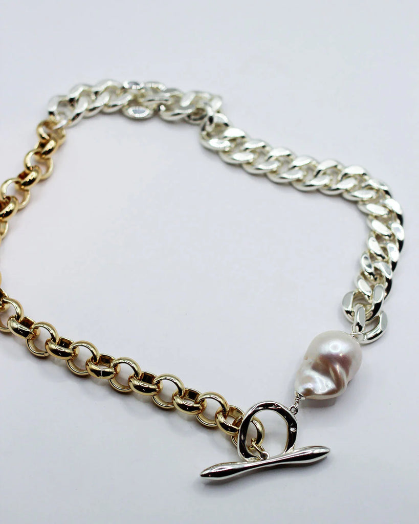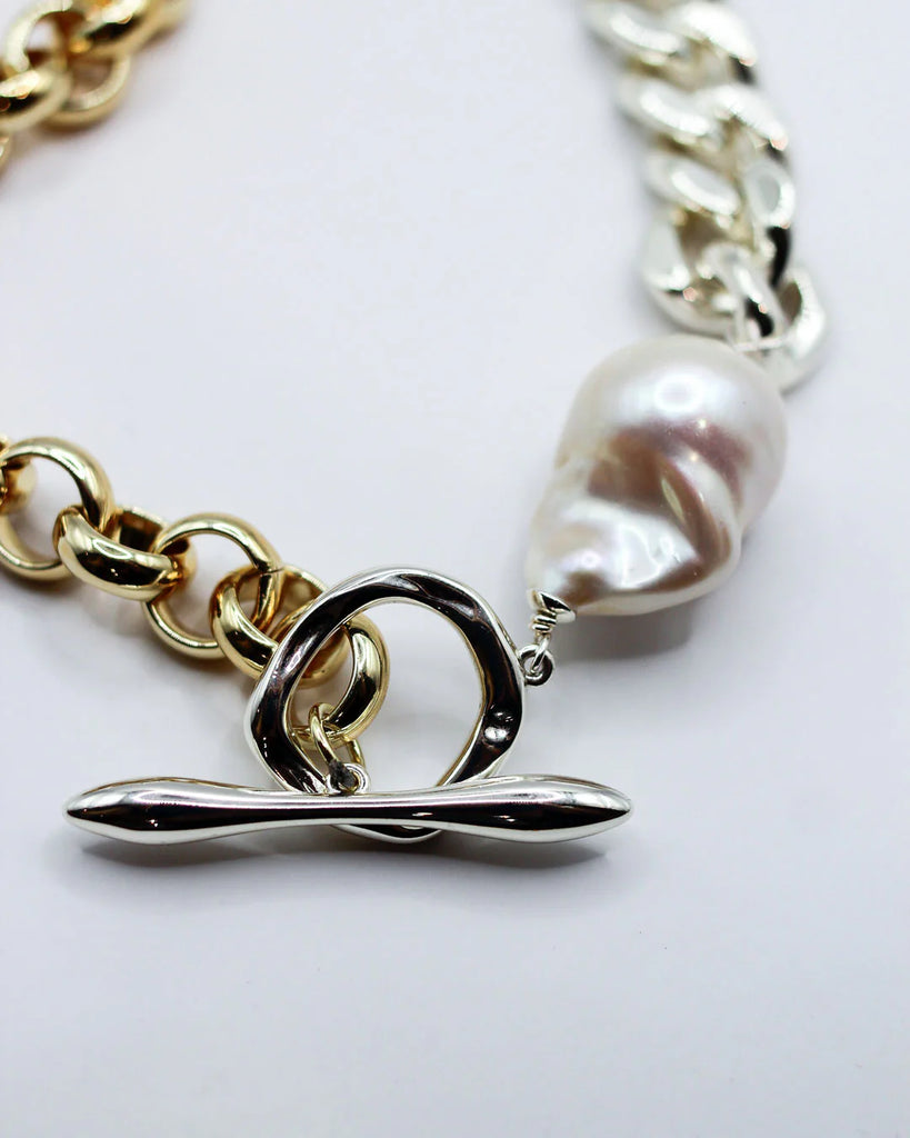 The F+H Studios Amalgamated Pearl Statement Necklace is the perfect statement necklace to elevate any outfit, with 18k gold plating and sterling silver chunky chains, adorned with our handcrafted fob clasp and an oversized baroque freshwater pearl.