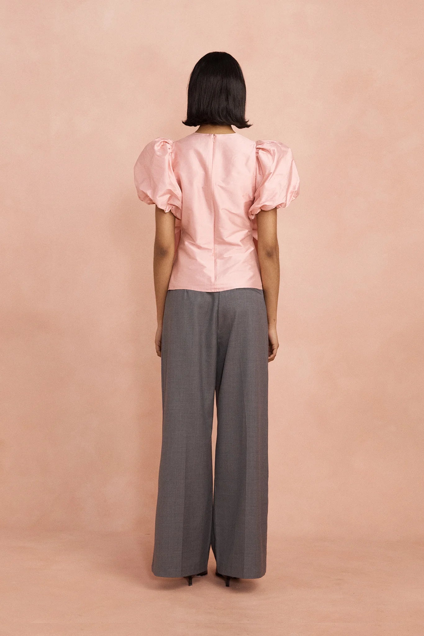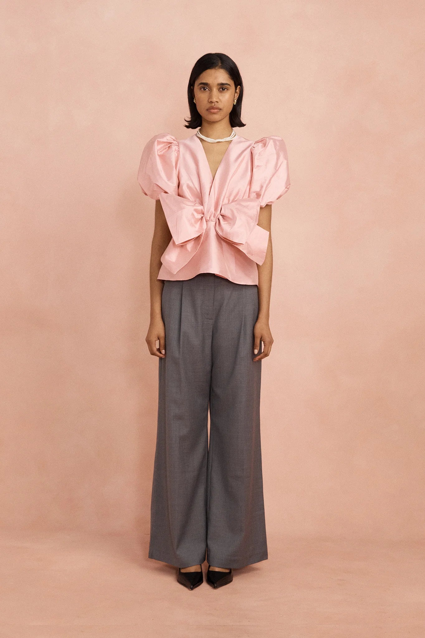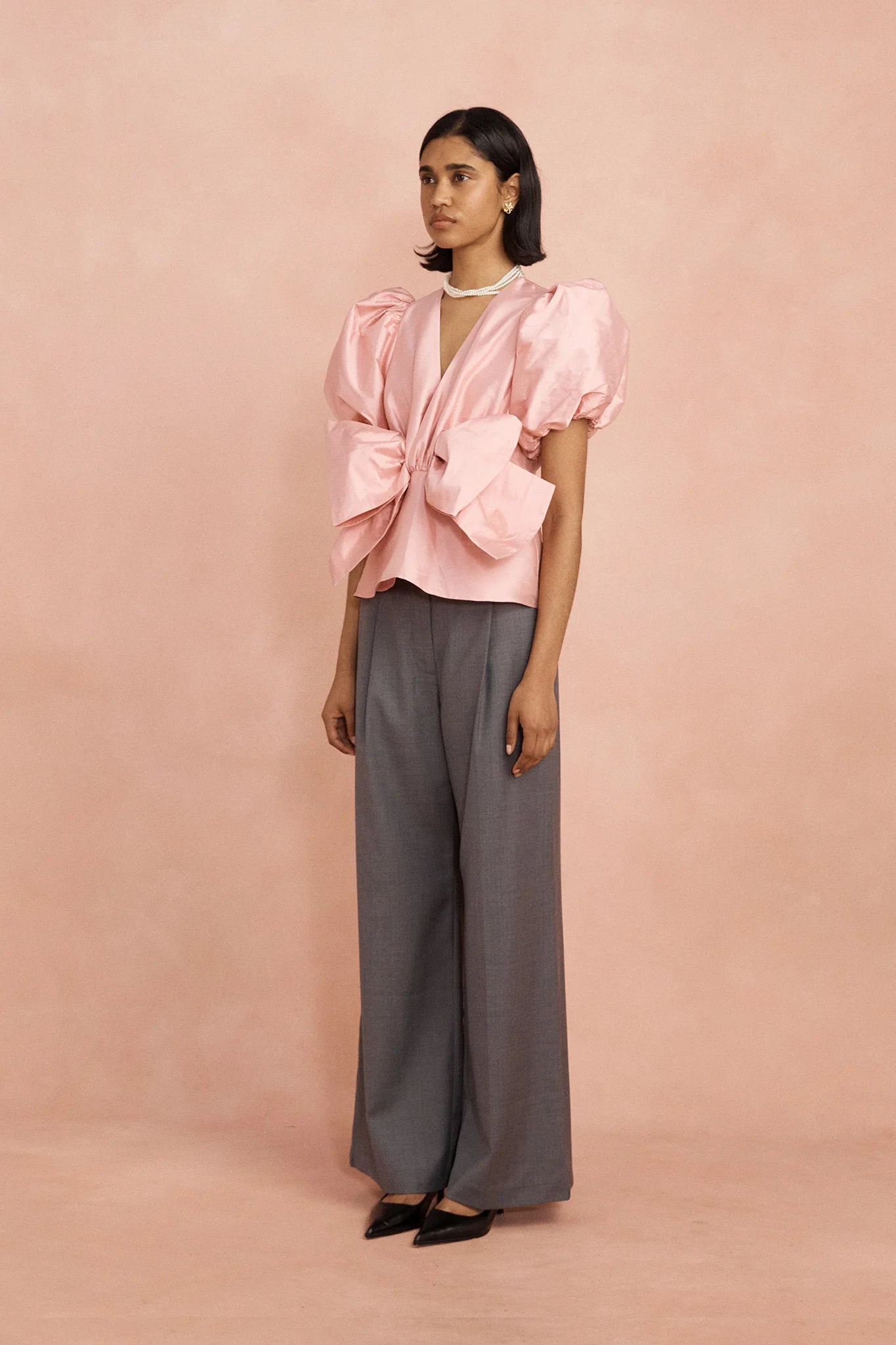 The Grace top in peony is a sculptural statement piece that balances softness with structure. Crafted from structured recycled taffeta, it features voluminous puff sleeves and a dramatic bow front detail, creating a bold yet feminine silhouette designed to elevate both tailored and relaxed looks.